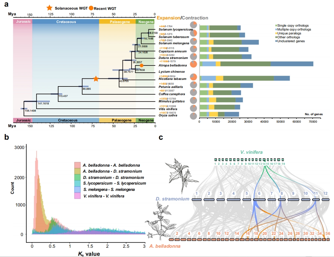 作者利用顛茄和曼陀羅,以及8個茄科物種和4種其他被子植物的207個單拷貝基因進行系統(tǒng)發(fā)育分析。結(jié)果表明:顛茄和枸杞屬于一個分支,而曼陀羅、辣椒、茄子、番茄和馬鈴薯屬于另一個分支,估計矮牽牛在約43Mya(33-56Mya)從茄科物種分化而來,曼陀羅在約28Mya(23-37Mya)由順茄和枸杞組成的分支分化而來,而顛茄在大約24Mya(18-31Mya)從枸杞分化而來。Ks分析顯示,茄科物種與其他高等雙子葉植物共享較古老的伽馬古多倍體事件。對顛茄、曼陀羅和葡萄進行基因組共線性分析,對于葡萄基因組的各個區(qū)域,通常在曼陀羅基因組中能鑒定出3個與之匹配的區(qū)域,并且在顛茄和曼陀羅之間也有相似的現(xiàn)象。