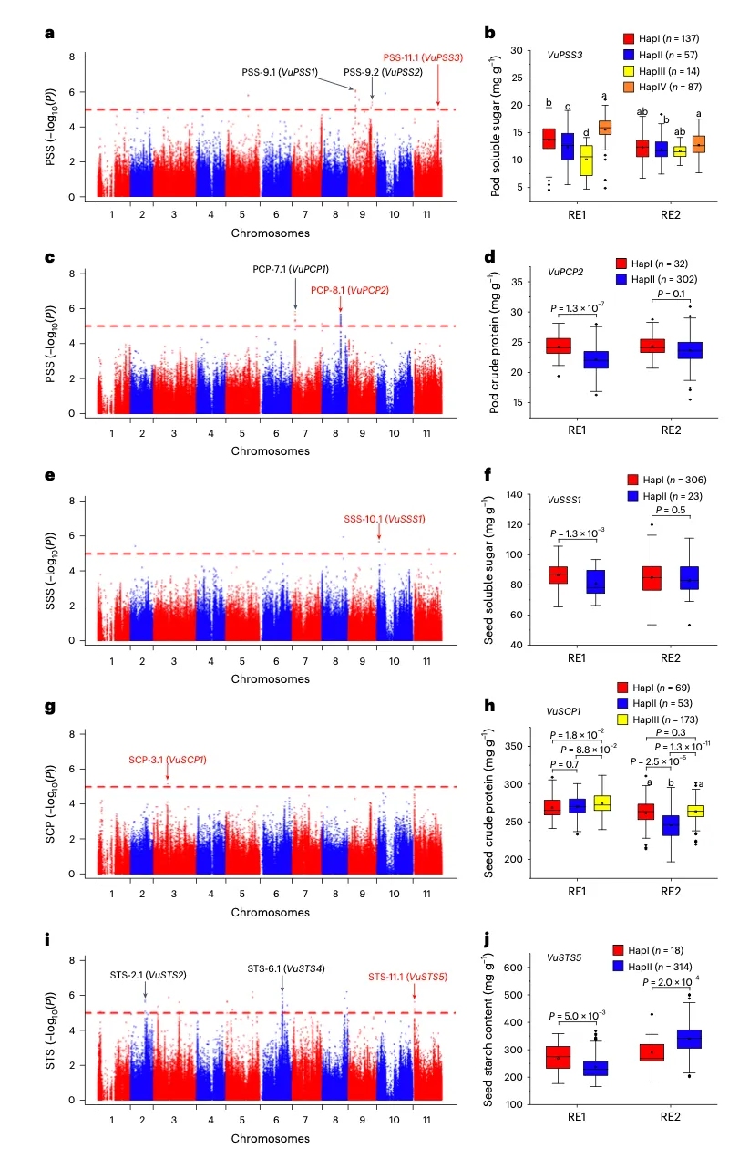 可溶性糖、總淀粉和粗蛋白質(zhì)含量是豆科作物的三個(gè)基本品質(zhì)性狀。GWAS分析檢測(cè)到三個(gè)信號(hào)與嫩莢可溶性糖含量(PSS)顯著相關(guān)(圖6a),其中VuPSS1可能是功能相關(guān)基因,VuPSS2可能通過其順式調(diào)控元件影響PSS含量,VuPSS3-HapIV單倍型是PSS的有利單倍型。嫩莢粗蛋白含量(PCP)差異可能與有利單倍型VuPCP1-HapII和VuPCP2-HapI有關(guān)。籽粒可溶性糖(SSS)含量相關(guān)的信號(hào)(圖6e)包含一個(gè)FAR1-related SEQUENCE (FAR1)家族蛋白(VuSSS1),F(xiàn)AR1在淀粉合成以及糖的運(yùn)輸和降解中起作用,VuSSS1-HapI為其有利單倍型(圖6f)。VuSCP2-HapIII和VuSCP2-HapIV通常導(dǎo)致更高的籽粒粗蛋白含量(SCP),VuSCP1和VuSCP2相似的表達(dá)模式提示它們可能影響種子發(fā)育中期的SCP表型。籽??偟矸酆浚⊿TS)GWAS分析檢測(cè)到5個(gè)相關(guān)信號(hào)(圖6i),STS-2.1中的VuSTS2含有一個(gè)MYB轉(zhuǎn)錄因子,STS-11.1中的VuSTS5編碼一個(gè)磷脂酰絲氨酸脫羧酶,該酶可能影響植物發(fā)育的關(guān)鍵調(diào)節(jié)因子磷脂酰絲氨酸。兩種基因的不同單倍型在兩種環(huán)境中表現(xiàn)出不同的STSs,這表明它們?cè)诤艽蟪潭壬鲜墉h(huán)境條件的影響(圖6j)。STS-3.1中的VuSTS3編碼了一個(gè)未知的蛋白,其中VuSTS3-HapIII對(duì)STS的影響最大。STS-6.1含有一個(gè)NAD依賴性蛋白去乙?;竀uSTS4,可能影響淀粉的生物合成和調(diào)控,而VuSTS4-HapI對(duì)STS的作用更強(qiáng)。以上結(jié)果有潛力成為糧用豇豆和菜用豇豆產(chǎn)量和品質(zhì)改善的遺傳資源。