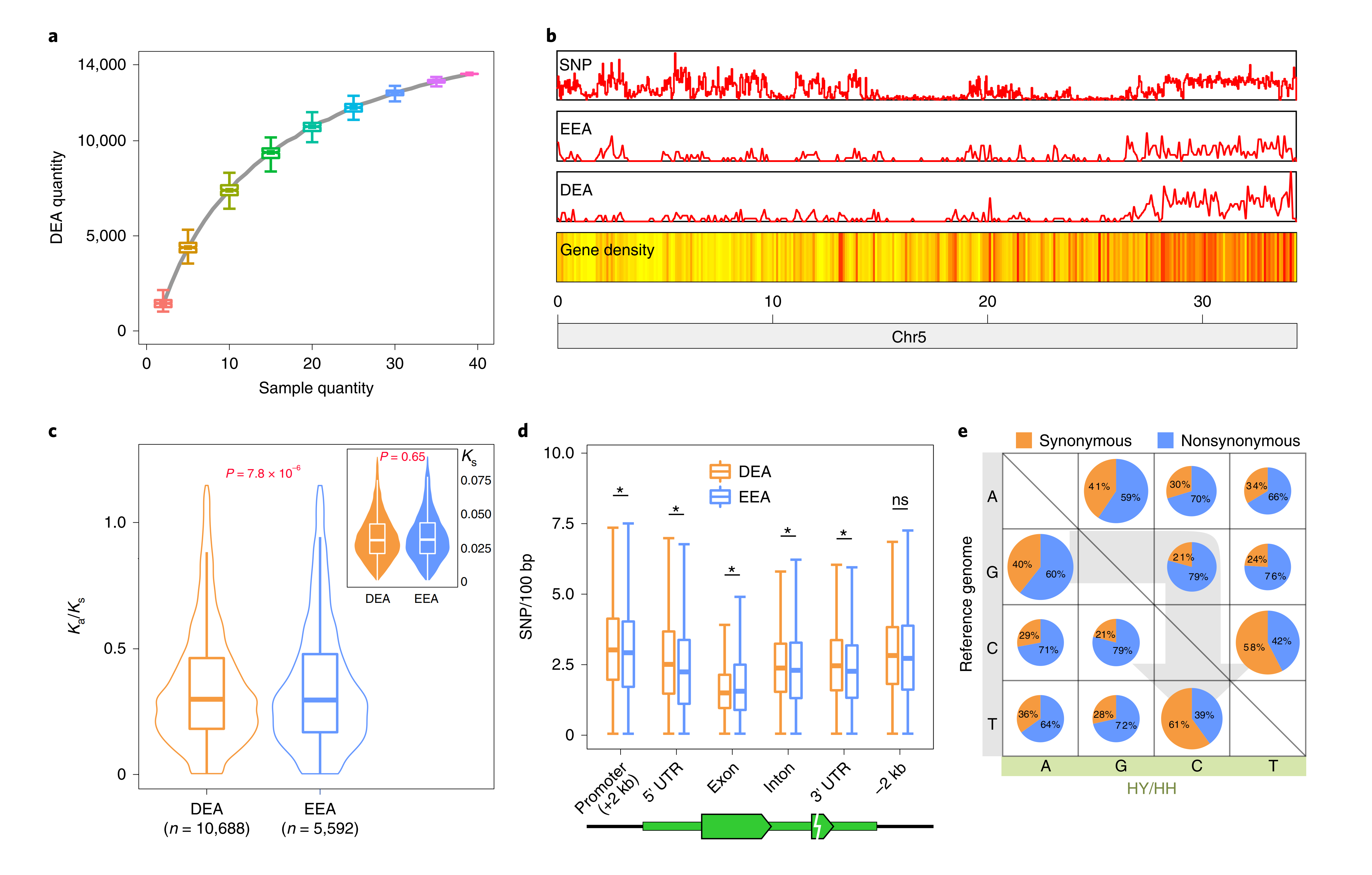 作者通過SNP分型和單細(xì)胞10x?Gemomics測序,利用“妃子笑”荔枝的高雜合性(2.27%),成功獲得的兩個單倍型的基因組(云南單倍型,HY;海南單倍型,HH)。對39個妃子笑”不同組織和時期樣本進(jìn)行轉(zhuǎn)錄組測序分析,共鑒定到13517個等位差異表達(dá)基因(DEA)。DEA在基因組上的分布并不是均勻的,在某些區(qū)域具有集中現(xiàn)象,可能與特定的生物學(xué)過程相關(guān)。還發(fā)現(xiàn),DEA和等位等量表達(dá)基因(EEA)具有相同的Ks值,但是DEA經(jīng)受更強(qiáng)的選擇壓力。