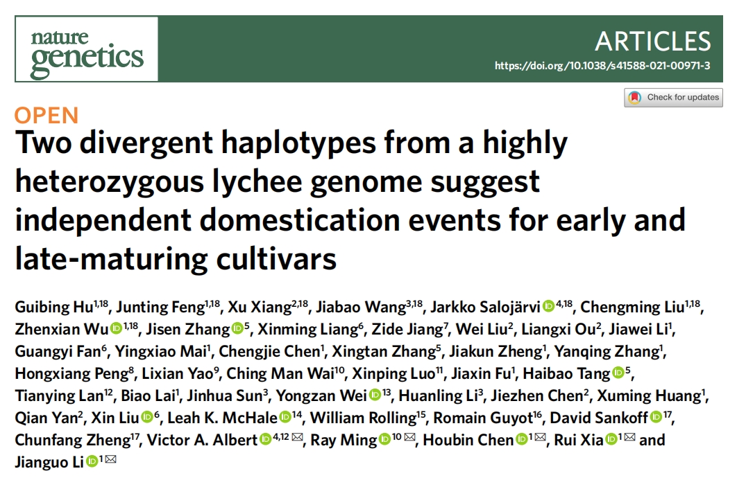文章標(biāo)題:Two divergent haplotypes from a highly heterozygous lychee genome suggestindependent domestication events for early and late-maturing cultivars