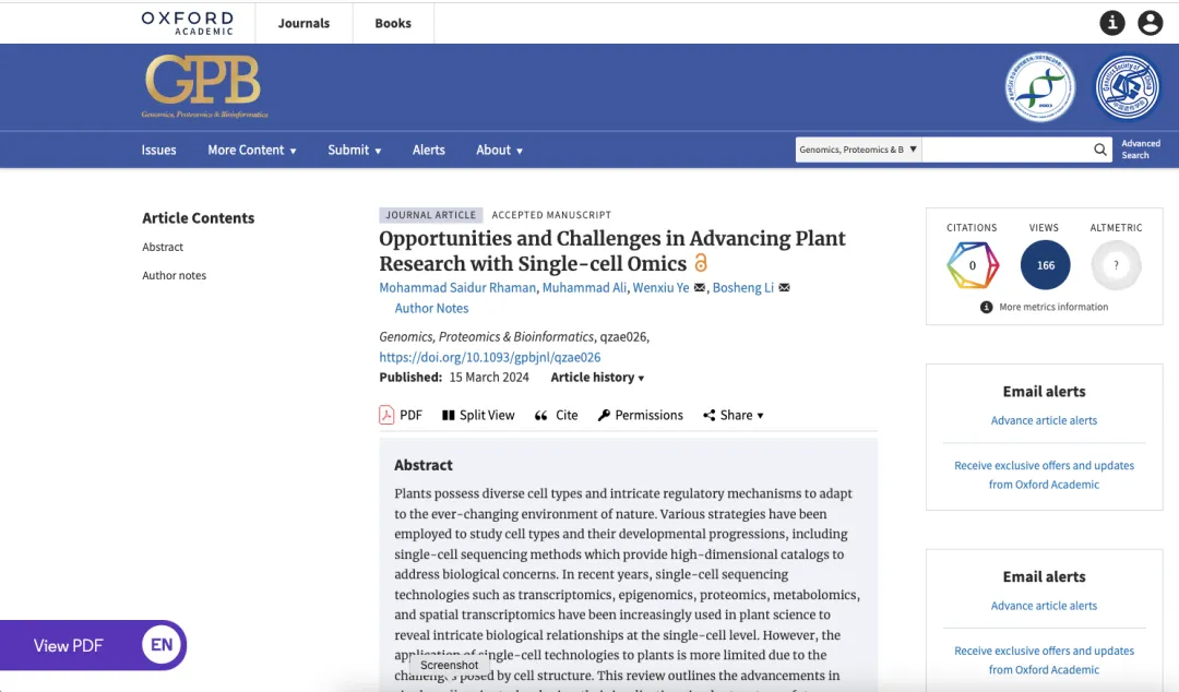 1.Rhaman,M.S.,Ali,M.,Ye,W.and Li,B.,2024.Opportunities and Challenges in Advancing Plant Researchwith Single-cell Omics.Genomics,Proteomics &Bioinformatics,p.qzae026.