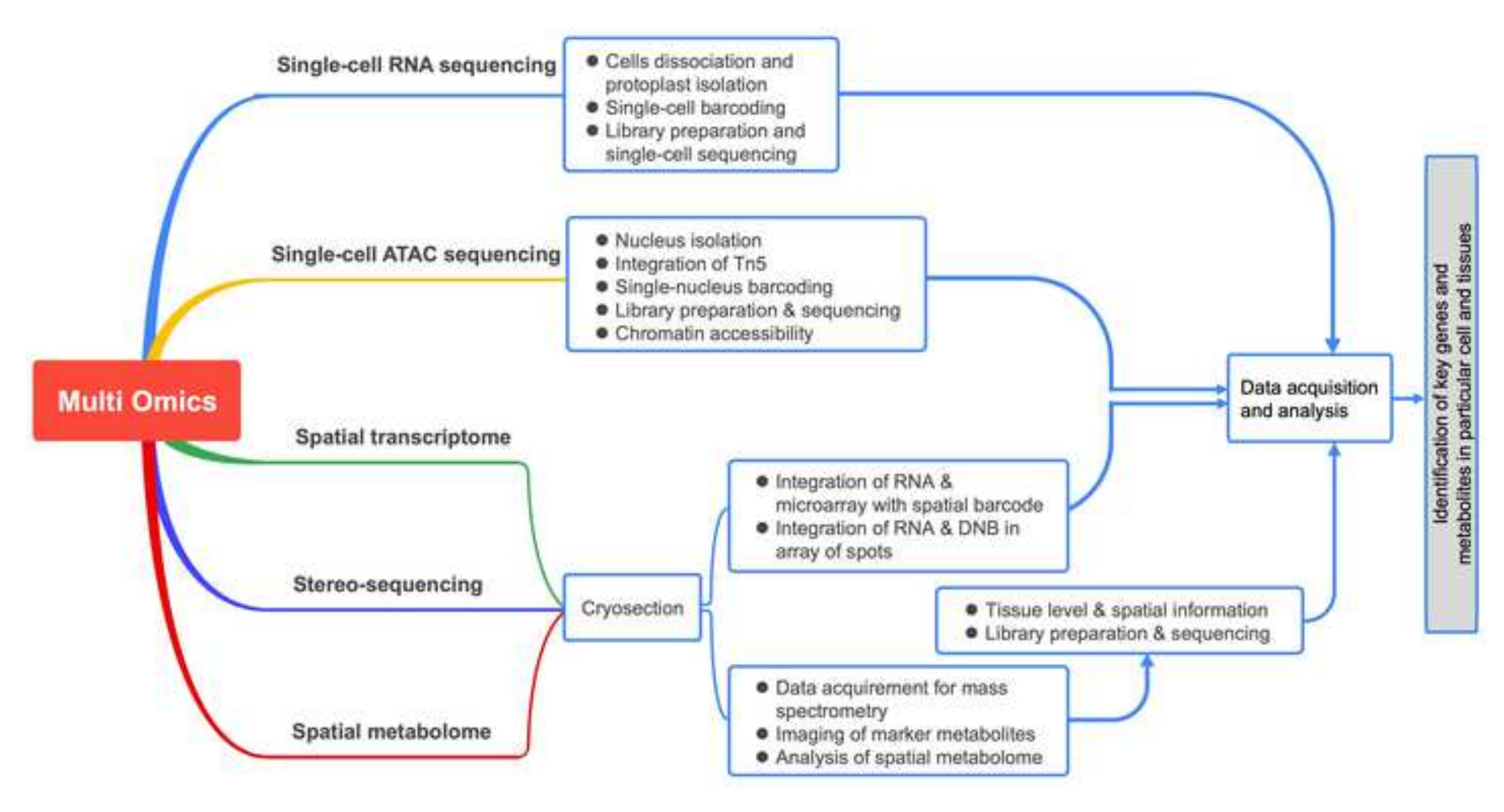 圖1-植物多組學(xué)研究流程圖,單細(xì)胞轉(zhuǎn)錄組測序、單細(xì)胞ATAC測序(可轉(zhuǎn)座酶可及染色質(zhì)測序)、空間轉(zhuǎn)錄組及空間代謝組在獲得特定類群細(xì)胞或組織基因表達(dá)及代謝信息的應(yīng)用。