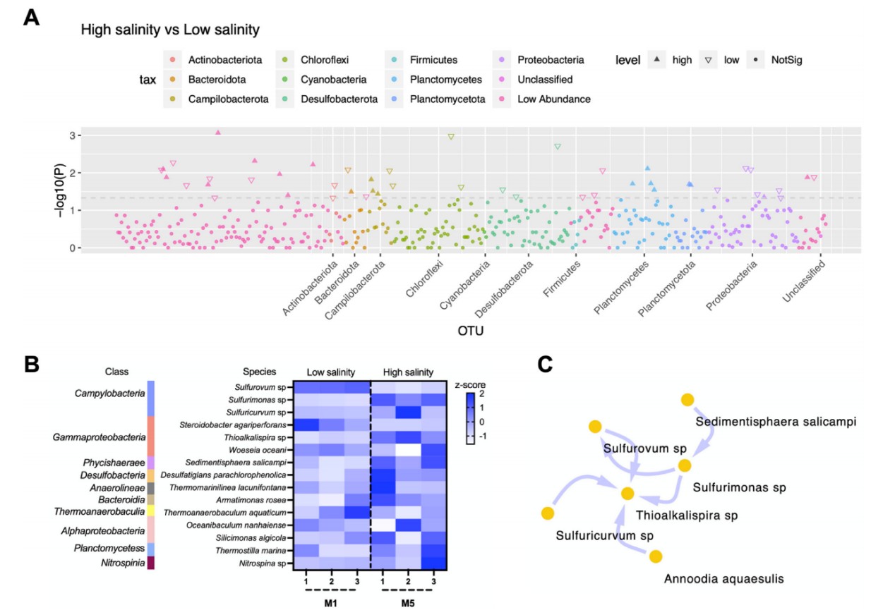 • 除低豐度細菌類群和未分類類群外,OTUs在低鹽度下富集的細菌門,包括放線菌門、氯化菌門、脫硫菌門、厚壁菌門和變形菌門,而高鹽度的群落包括彎曲菌和普朗菌;
