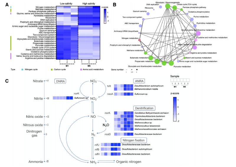 • 功能基因通過KEGG途徑富集的結(jié)果表明,氮代謝相關功能基因在高鹽環(huán)境下的表達水平高于低鹽環(huán)境,而碳和氨基酸代謝相關功能基因在低鹽環(huán)境下的表達水平高于高鹽環(huán)境。這表明SWI通過建立鹽度梯度刺激氮循環(huán);