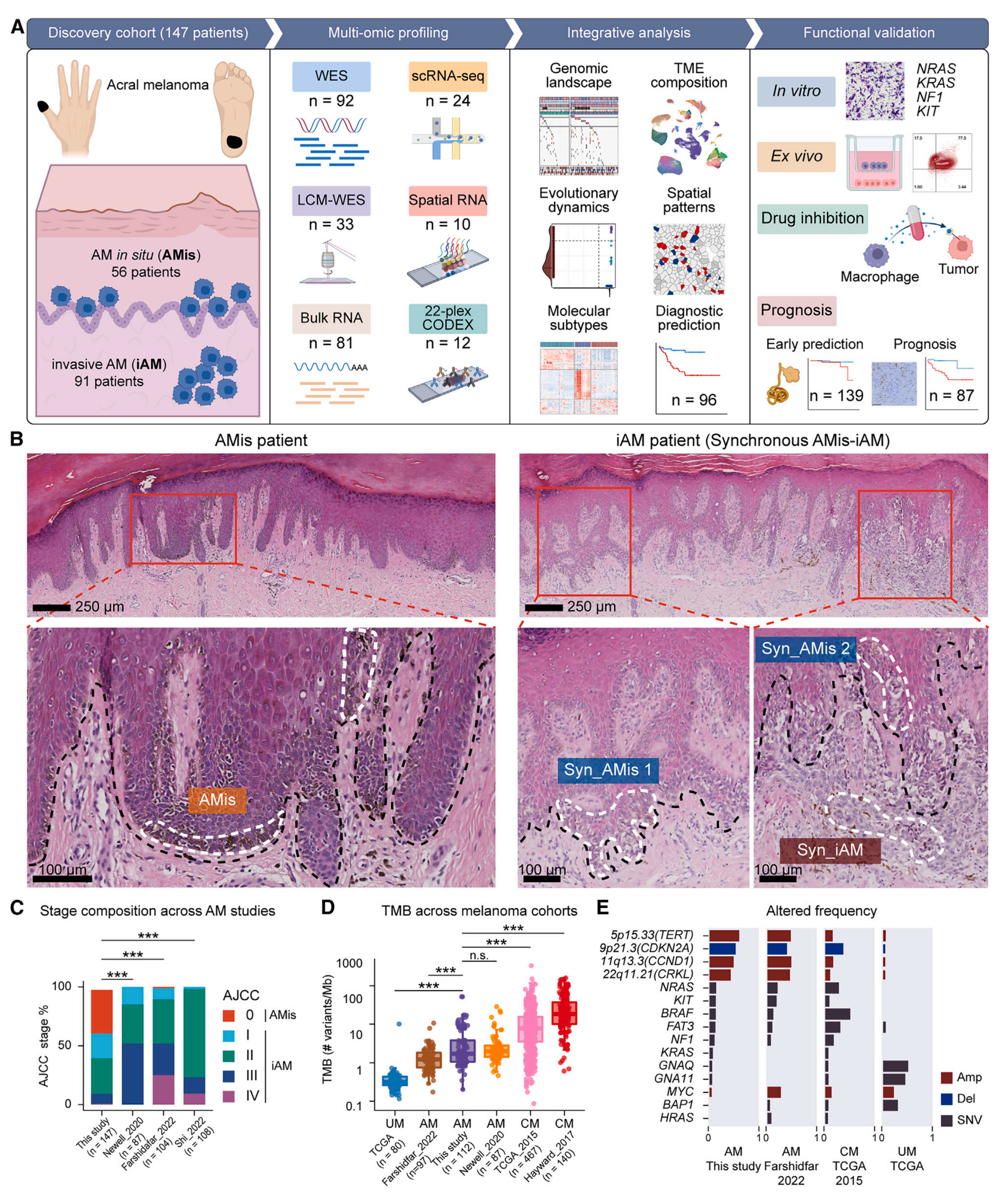 肢端型黑色素瘤(acral melanoma, AM)是一種起源于手掌、足底和甲下等部位的惡性皮膚腫瘤,也是亞洲人群中最主要的黑色素瘤亞型,常發(fā)生轉(zhuǎn)移且預(yù)后不佳。原位AM(AM in situ, AMis)經(jīng)手術(shù)切除后極少復(fù)發(fā),但侵襲性AM(invasive AM, iAM)的預(yù)后不佳,且PD-1單抗治療響應(yīng)率僅約20%-30%,缺乏有效的治療策略。因此,AMis突破基底膜進(jìn)入真皮發(fā)展為iAM是造成患者預(yù)后變差的重要里程碑事件。然而,目前關(guān)于AMis的研究仍然十分有限,AMis向iAM的演化過程尚不清楚,免疫微環(huán)境在這一過程中發(fā)揮的作用也不明確。AM的早期發(fā)現(xiàn)和預(yù)防可以顯著提高病人預(yù)后和治療。