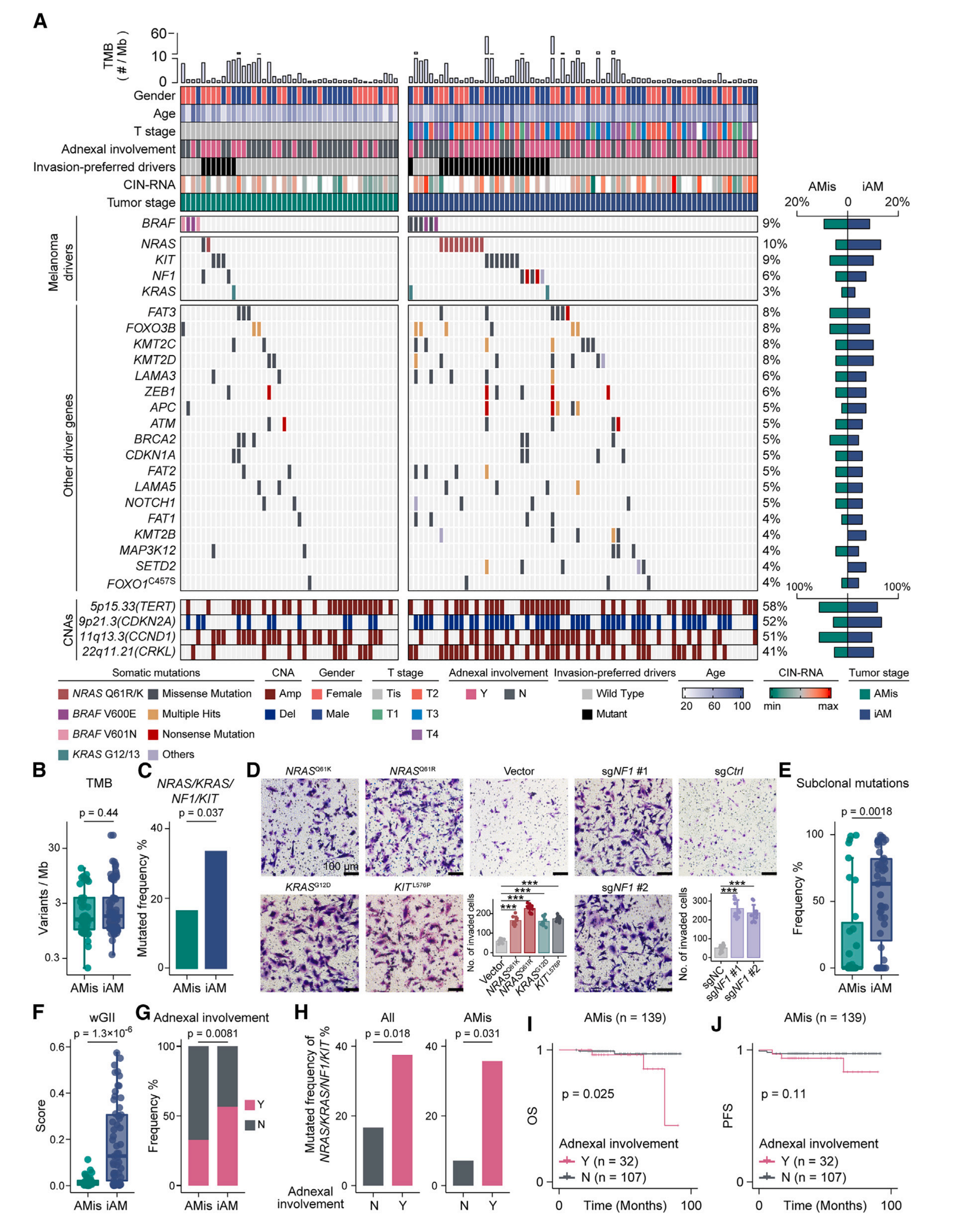 值得注意的是,研究人員發(fā)現(xiàn)驅(qū)動(dòng)突變(NRAS, KRAS, NF1, KIT)在iAM中顯著富集,并在體外實(shí)驗(yàn)中驗(yàn)證了這些驅(qū)動(dòng)突變可以增強(qiáng)肢端型黑色素瘤的侵襲能力。這些結(jié)果表明AM侵襲高度依賴于獲得某些驅(qū)動(dòng)突變,而不是簡(jiǎn)單地積累更多的突變。