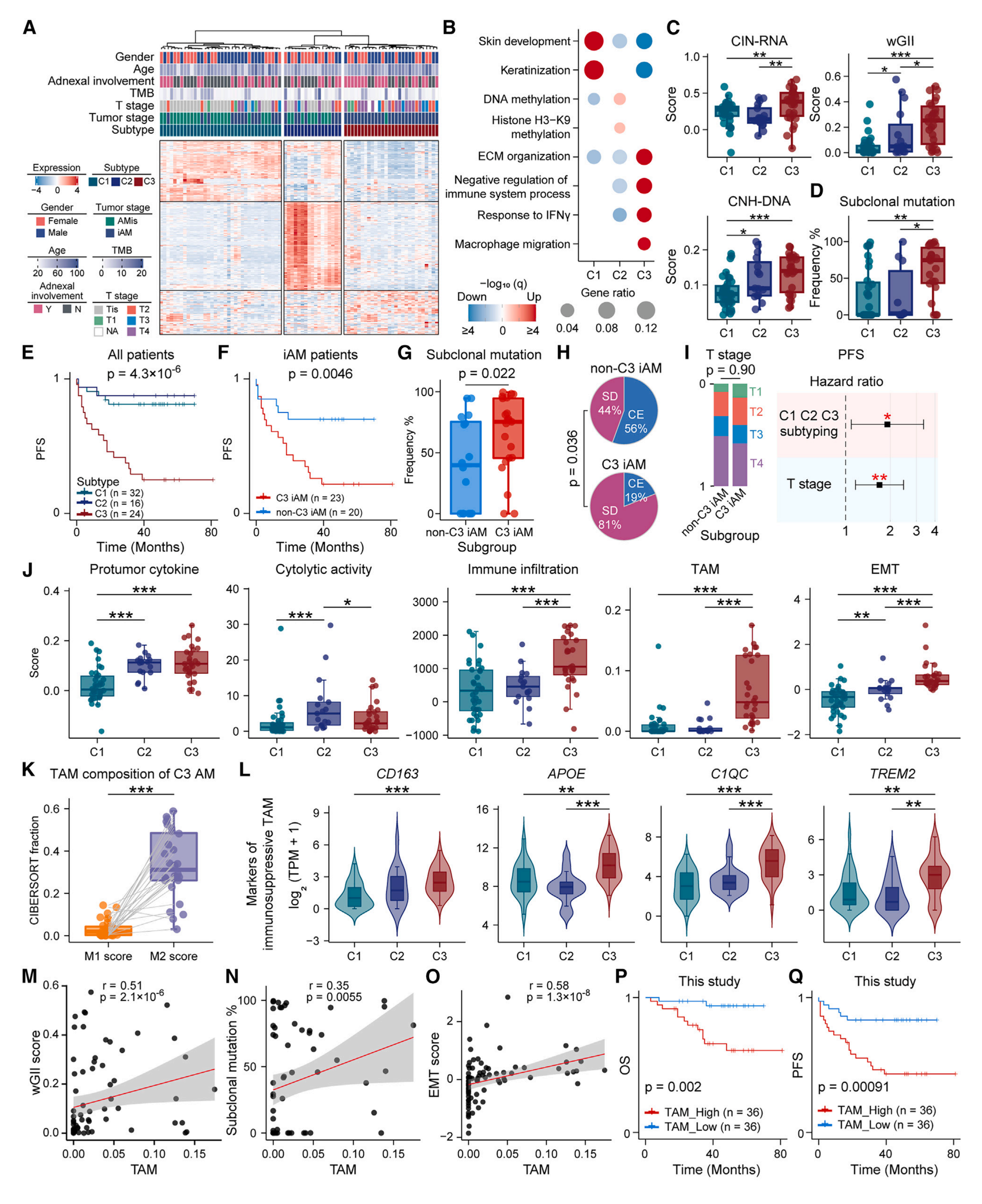 為了進(jìn)一步了解AM分子亞型,本文利用bulk RNA-seq對(duì)81名患者進(jìn)行檢測(cè),確定C1、C2、C3三種分子亞型。C1亞型作為“角蛋白”亞型,C2亞型提示“染色質(zhì)重塑”表型,C3亞型表現(xiàn)出“增殖”表型。C3亞型亞克隆突變比例最高,且預(yù)后最差。其中C1和C2是均勻混合AMis和iAM,C3亞型高度富集iAM,表明iAM是一個(gè)獨(dú)特的子集。與非C3 iAM(C1和C2 iAM)相比較,C3 iAM表現(xiàn)為PFS縮短和明顯的惡性現(xiàn)象類型,尤其值得注意的是C3 iAM表現(xiàn)出顯著性更多的亞克隆突變。同時(shí)發(fā)現(xiàn)C3亞型表現(xiàn)出較高水平的免疫浸潤(rùn)、腫瘤相關(guān)巨噬細(xì)胞(TAM)和EMT,而通過這三種AM分子亞型來看腫瘤負(fù)荷與TAM評(píng)分是相互獨(dú)立的。相比之下,TAM評(píng)分與基因組不穩(wěn)定性相關(guān),包括wGII和CNH-DNA評(píng)分以及亞克隆突變。此外, TAM評(píng)分與EMT評(píng)分相關(guān)和預(yù)后差。這些結(jié)果共同表明TAM的浸潤(rùn)可能會(huì)促進(jìn)C3的腫瘤EMT和基因組不穩(wěn)定性并導(dǎo)致預(yù)后不良。