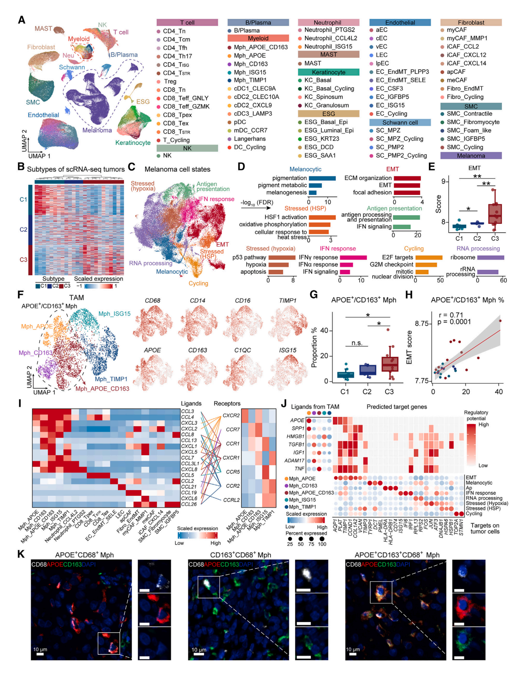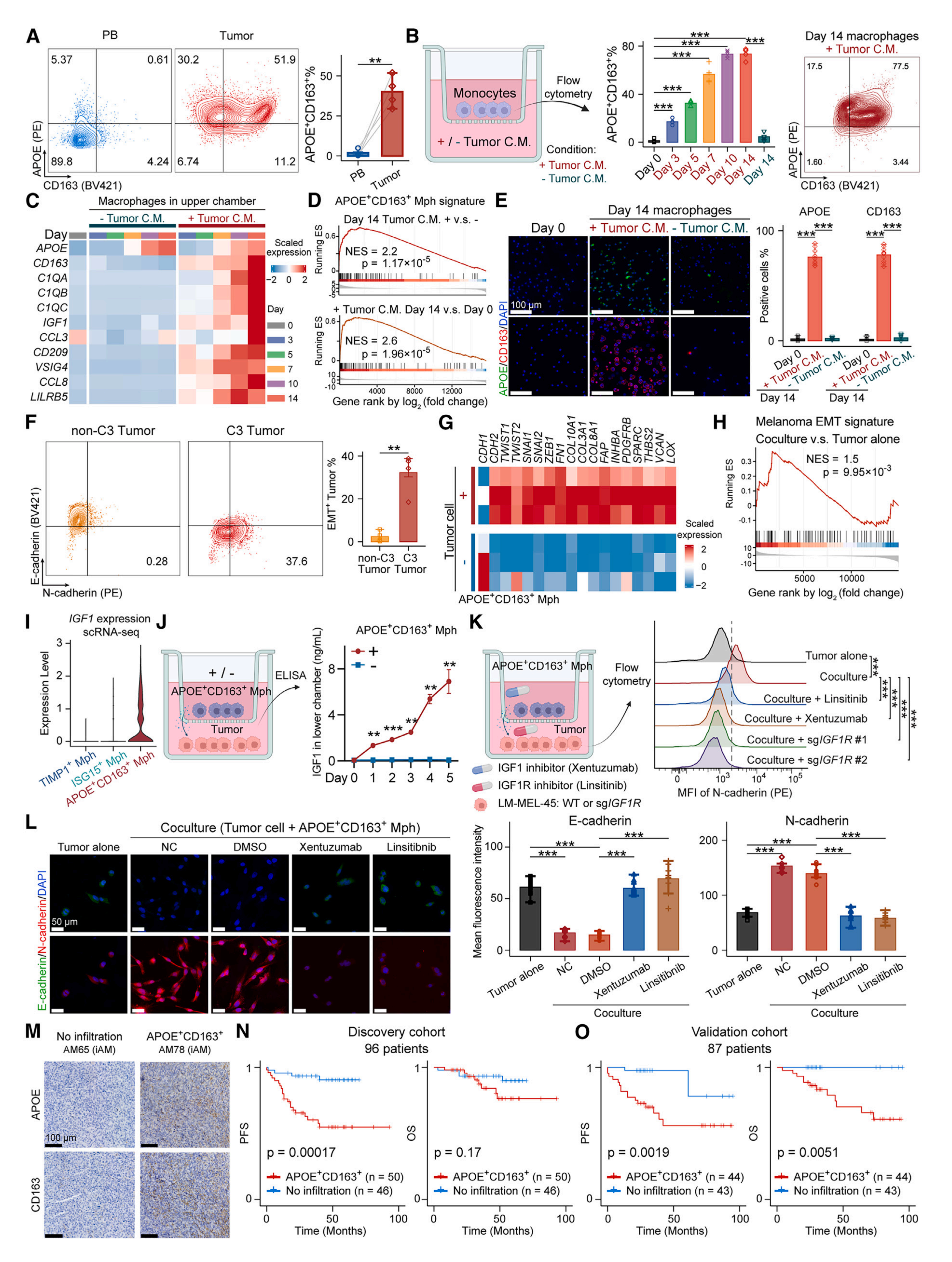 驗(yàn)證實(shí)驗(yàn):流式分選巨噬細(xì)胞(AM患者腫瘤組織和配對(duì)外周血,n=4);健康供體外周血單核細(xì)胞和 LM-MEL-45腫瘤細(xì)胞系C.M.共培養(yǎng)(0、3、5、7、10、14天,n=3);流式分選C3患者和非C3患者EMT腫瘤細(xì)胞(n=4);APOE+/CD163+巨噬細(xì)胞和腫瘤細(xì)胞共培養(yǎng)體系(n=3);LM-MEL-45腫瘤細(xì)胞系:野生型和IGF1R KO,IGF1抑制劑處理(xentuzumab),IGF1R抑制劑處理(linsitinib)