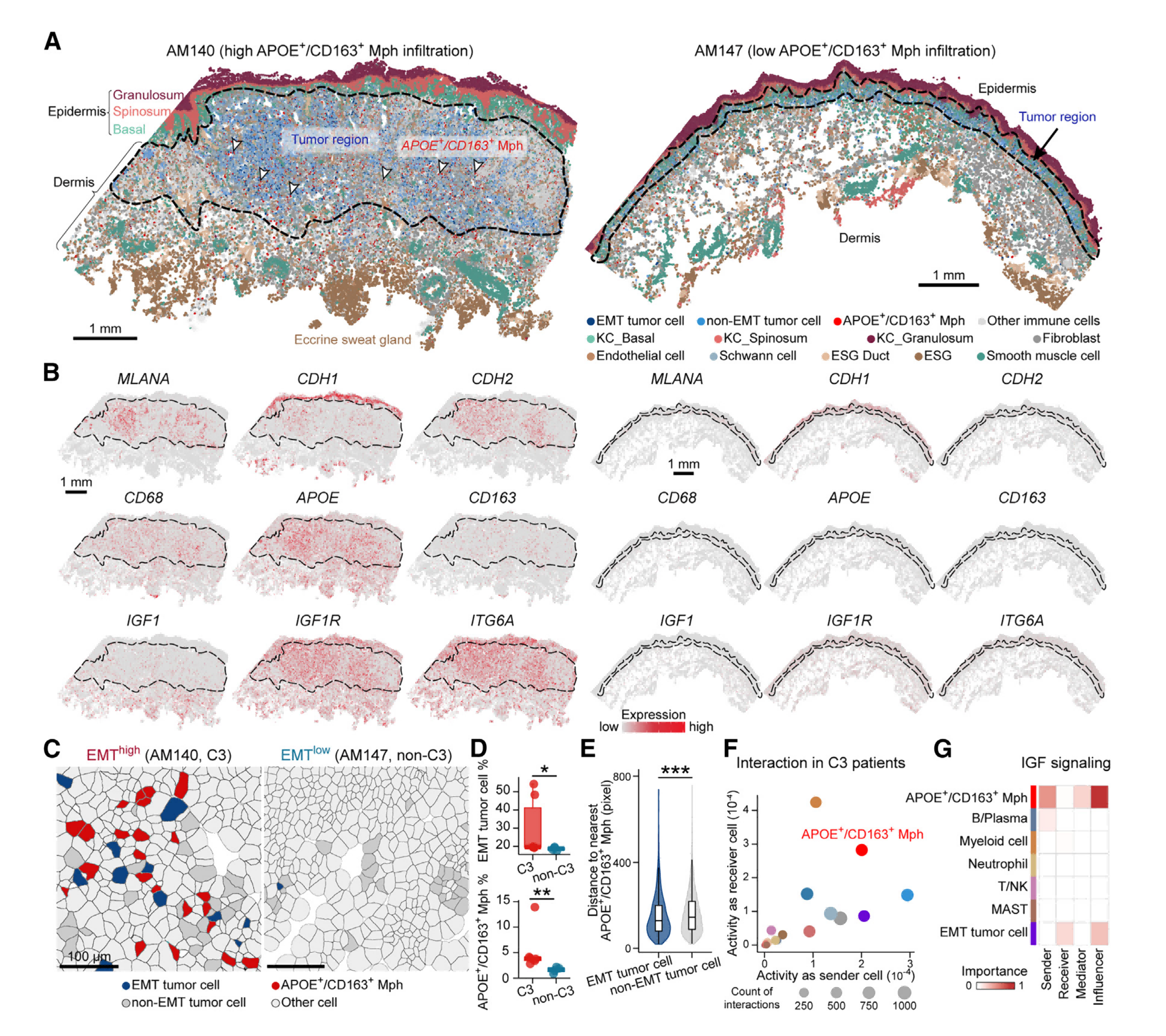 為了探索APOE+/CD163+ TAM與EMT高水平的腫瘤細(xì)胞相關(guān)作用,通過空間轉(zhuǎn)錄組測(cè)序技術(shù)(ST,BMKMANU S1000)檢測(cè)10個(gè)AM樣品。結(jié)果可清晰觀察到腫瘤組織多層結(jié)構(gòu),包括表皮層:基層、棘層和顆粒層、以及分泌汗腺的皮下結(jié)構(gòu)和血管。在C3 iAM患者中,腫瘤區(qū)域富集大量的EMT高水平的腫瘤細(xì)胞,同時(shí)也高度浸潤(rùn)了APOE+/CD163+ TAM,而在非C3患者中無法發(fā)現(xiàn)這種共存。正如預(yù)期的那樣,C3患者表現(xiàn)出EMT腫瘤細(xì)胞比例明顯較高,并且APOE+/CD163+ TAM水平增高。C3患者中,在空間位置上APOE+/CD163+ TAM更接近EMT腫瘤細(xì)胞。CellChat分析顯示APOE+/CD163+ TAM作為信號(hào)發(fā)送者(配體)和接收著(受體)均表現(xiàn)出高活性,證實(shí)了其具有細(xì)胞與細(xì)胞強(qiáng)互作。與其他免疫細(xì)胞相比,APOE+/CD163+ TAM表現(xiàn)出最高水平的胰島素生長(zhǎng)因子(IGF)信號(hào)網(wǎng)絡(luò)的發(fā)送細(xì)胞和接收細(xì)胞,這些結(jié)果揭示APOE+/CD163+ TAM和EMT腫瘤細(xì)胞在空間上的直接接觸和密切相互作用。