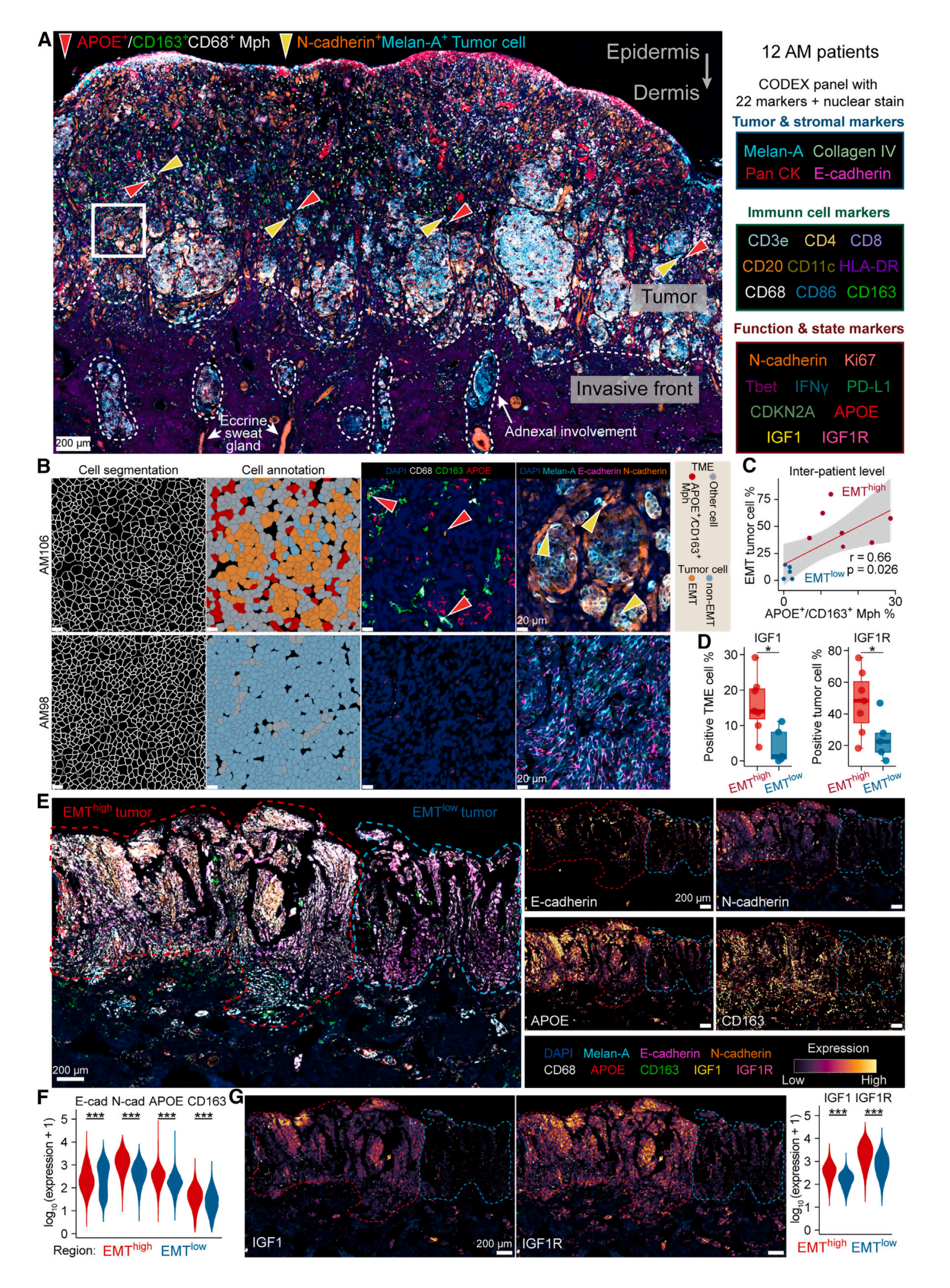 進(jìn)一步驗(yàn)證APOE+/CD163+?TAM和EMT腫瘤細(xì)胞在蛋白水平上的空間分布和相互作用,文中對(duì)12個(gè)AM樣本進(jìn)行了空間蛋白組檢測(cè)(22 plex CODEX)。其中C3患者以EMT腫瘤區(qū)域?yàn)橹鳎荂3患者以非EMT腫瘤區(qū)域?yàn)橹?,結(jié)果表明APOE+/CD163+ TAM與EMT腫瘤細(xì)胞呈正相關(guān)。在C3患者中,IGF1和IGF1R的表達(dá)水平均顯著升高。APOE+/CD163+ TAM高度富集在EMThigh區(qū)域。同時(shí)IGF1和IGF1R在EMThigh區(qū)域也顯著升高。這些結(jié)果在單細(xì)胞水平和空間水平均支持APOE+/CD163+?TAM可能通過IGF1-IGF1R相互作用促進(jìn)腫瘤細(xì)胞的EMT。