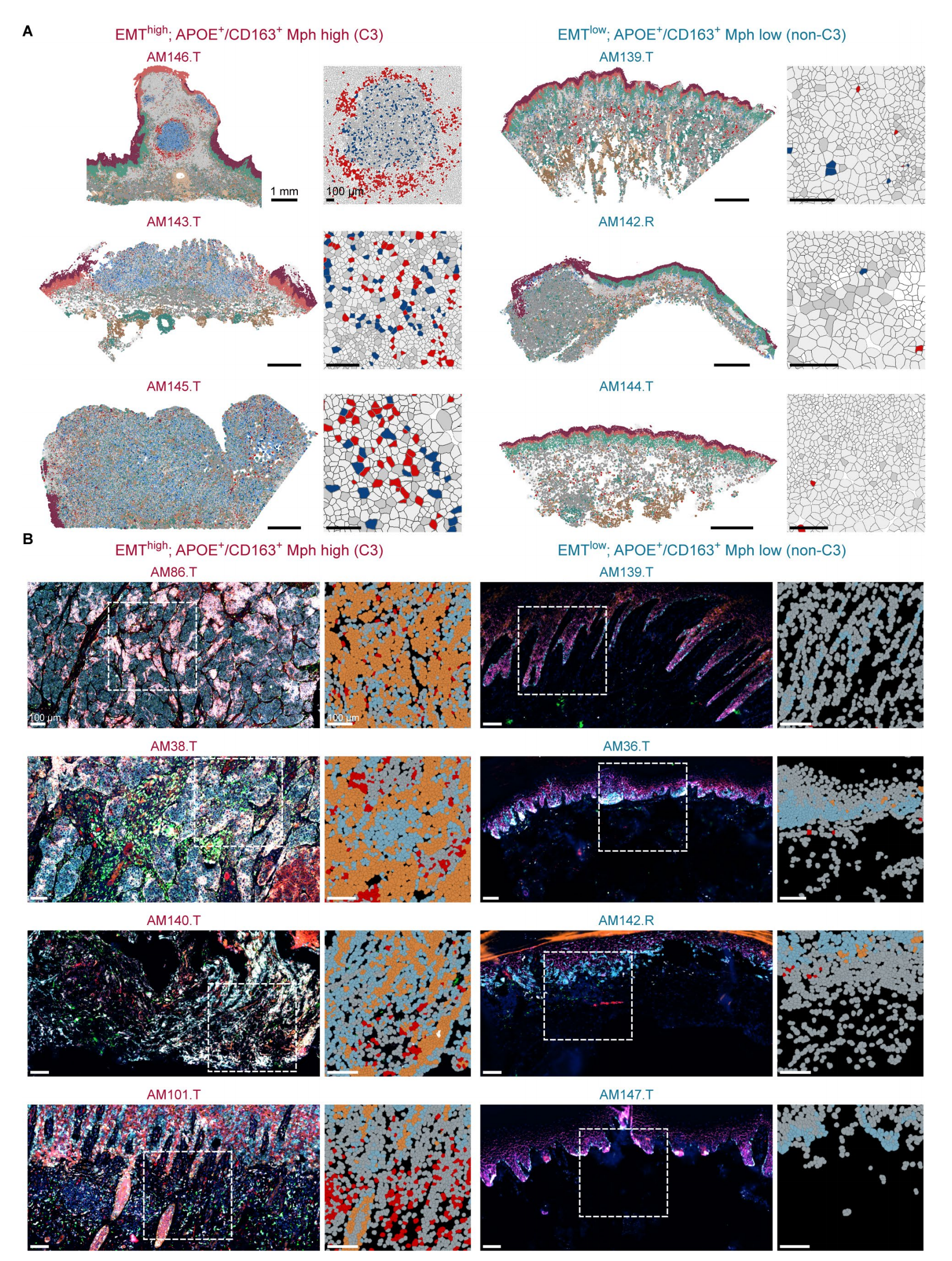 圖7-空間轉(zhuǎn)錄組細(xì)胞分割和空間蛋白組鑒定APOE+/CD163+ TAM與EMT腫瘤細(xì)胞共定位 A 細(xì)胞分割:紅色:APOE+/CD163+巨噬細(xì)胞 ;藍(lán)色:EMT腫瘤細(xì)胞;灰色:其他腫瘤細(xì)胞 B 細(xì)胞分割:紅色:APOE+/CD163+巨噬細(xì)胞;橙色:EMT腫瘤細(xì)胞;藍(lán)色:其他腫瘤細(xì)胞;灰色:其他細(xì)胞。