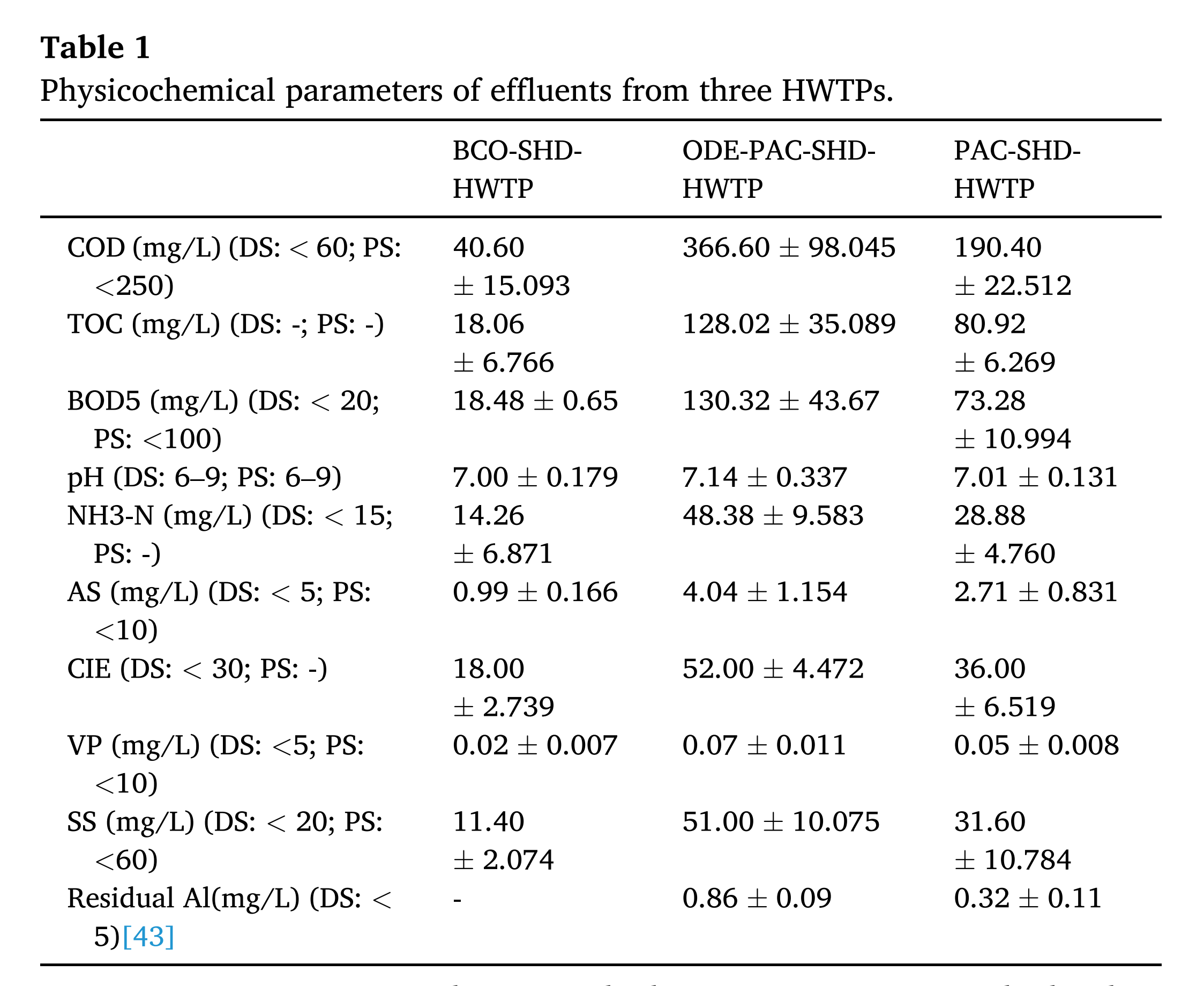 該研究共同評(píng)估了九種常見的理化指標(biāo),這些指標(biāo)在三個(gè)污水處理廠的出水點(diǎn)表現(xiàn)出明顯的梯度分布。在這些指標(biāo)上,ODE-PAC-HWTP 超過了 PAC-HWTP,PAC-HWTP 超過了 BCO-HWTP。BCO-HWTP出水中COD、BOD5、pH、NH3-N、AS、Color、VP、SS等濃度基本符合國家排放標(biāo)準(zhǔn)。PAC-HWTP 出水的 COD、BOD5、pH、NH3-N、AS、顏色、VP 和 SS 水平通常符合國家預(yù)處理標(biāo)準(zhǔn),允許排放到通向市政污水處理廠的下水道中。相反,ODE-PAC-HWTP出水中COD和BOD5的濃度超過國家預(yù)處理標(biāo)準(zhǔn)。此外,還對(duì)兩個(gè)經(jīng) PAC 處理的 HWTP 出水中的殘留鋁濃度進(jìn)行了測試。在 ODE-PAC-HWTP 和 PAC-HWTP 的出水中,檢測到的殘留 Al 濃度分別為 0.86 ± 0.09 mg/L 和 0.32 ± 0.11 mg/L。這些值符合 2002 年環(huán)境保護(hù)法制定的鋁廢水排放標(biāo)準(zhǔn),該標(biāo)準(zhǔn)規(guī)定限值為 5.0 mg/L 。