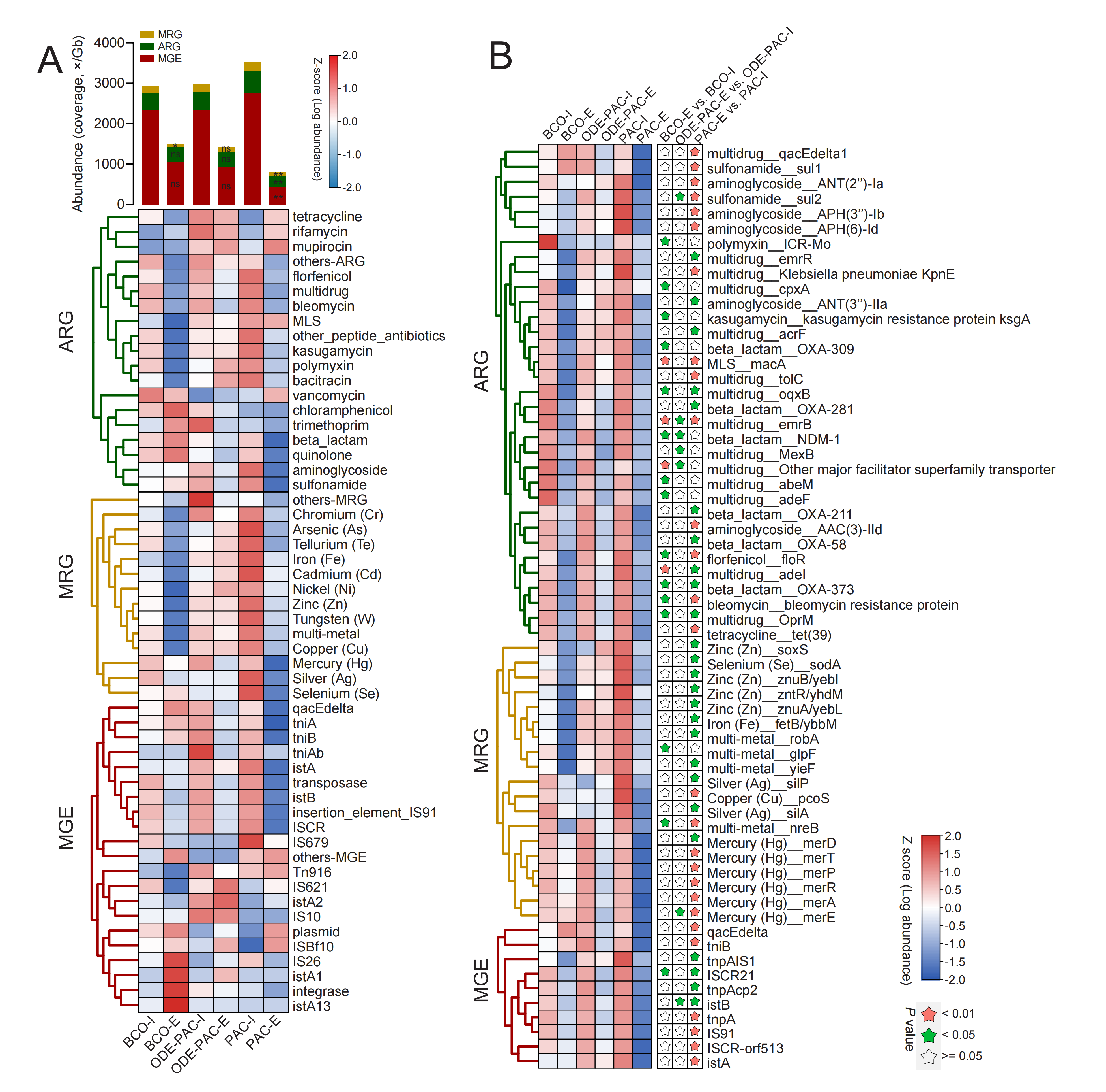 在三個(gè) HWTP 的進(jìn)水和出水中鑒定出了來自 17 個(gè) MRG 類型的 194 個(gè) MRG 亞型。在三個(gè) HWTP 的污水中,總 MRG 相對(duì)豐度始終低于進(jìn)水;然而,統(tǒng)計(jì)分析表明僅 BCO-HWTP 和 PAC-HWTP 的數(shù)據(jù)存在顯著差異(圖2A)。BCO-HWTP、ODE-PAC-HWTP和PACHWTP中MRG相對(duì)豐度的平均去除效率分別為42.08%、19.92%和57.54%。BCO-HWTP和PAC-HWTP出水中MRG的總相對(duì)豐度低于ODE-PAC-HWTP。主要的 MRG 類型包括多金屬、汞 (Hg)、銅 (Cu)、砷 (As)、鋅 (Zn)、銀 (Ag) 和鎳 (Ni)。與 BCO-HWTP 和 ODE-PAC-HWTP 相比,PAC-HWTP 中多種 MRG 類型的相對(duì)豐度在出水中低于進(jìn)水中(圖2A)。在三個(gè) HWTP 的廢水中,觀察到 19 種 MRG 的相對(duì)豐度顯著降低。具體來說,BCO-HWTP 中 2 個(gè) MRG 的減少,ODE-PAC-HWTP中 1個(gè) MRG 的減少,PAC-HWTP 中 18 個(gè) MRG 的顯著減少(圖2B)。這些結(jié)果表明,與ODEPAC-HWTP 相比,BCO-HWTP 和 PAC-HWTP 能更有效地去除 MRG。