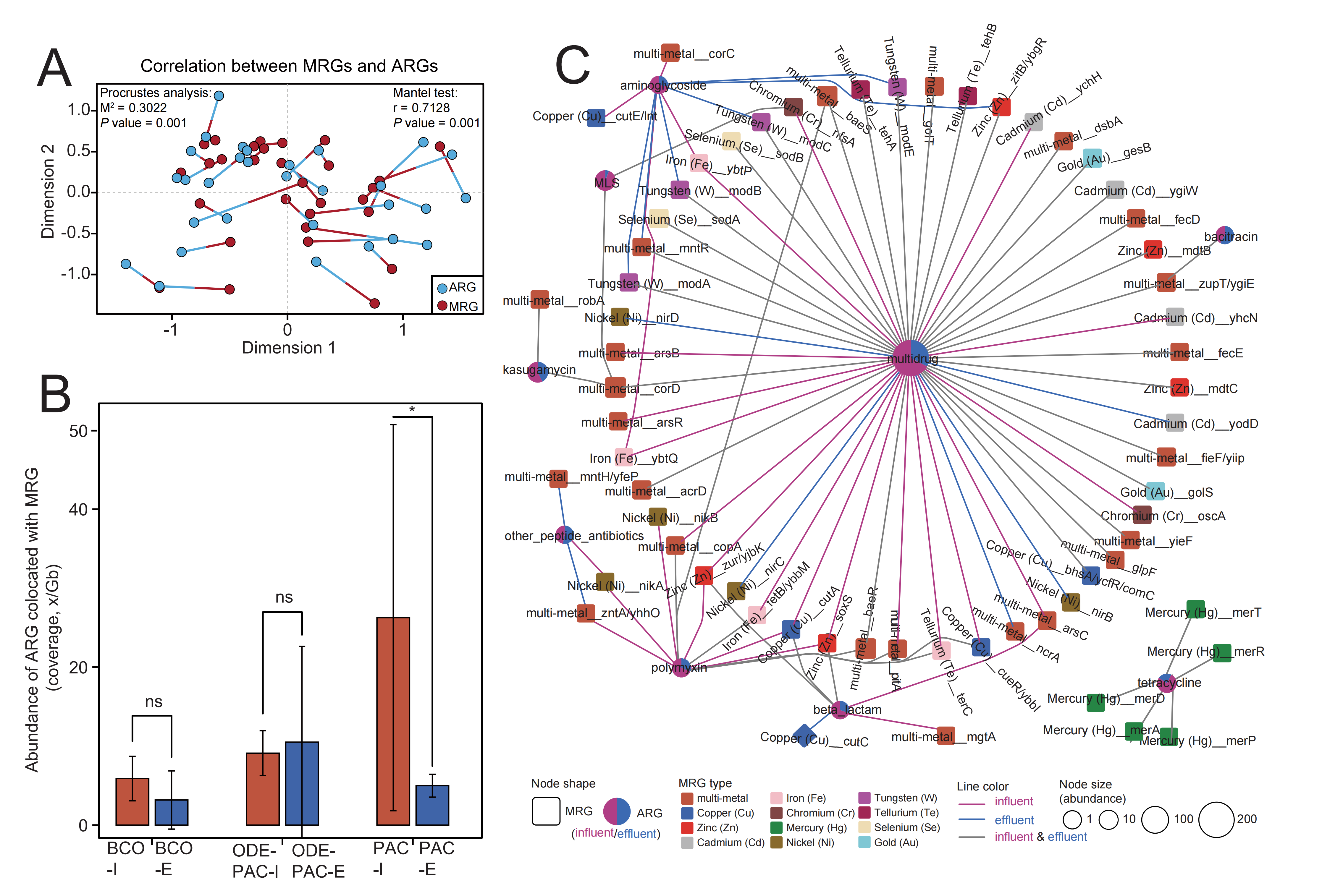 研究了HWW中ARGs和MRGs的豐度之間的關(guān)聯(lián),以確定ARGs共同選擇的相對(duì)影響。Mantel測試和Procrstes分析表明,ARG和MRG之間的成分相似性在統(tǒng)計(jì)上具有顯著的一致性(圖3a)。在PAC-HWTP和BCO-HWTP出水中,與MRGs基因共處的ARGs的相對(duì)豐度低于進(jìn)水中的ArGs。然而,統(tǒng)計(jì)分析表明,只有來自PAC-HWTP的數(shù)據(jù)存在顯著差異。相反,在ODE-PAC-HWTP的出水中,與MRGs基因共存的ArGs的相對(duì)豐度呈現(xiàn)出增加的趨勢(圖3B)。共有9種類型的ARG與65個(gè)MRG亞型遺傳共存。共確定了92個(gè)不同的ARG-MRG(一對(duì)一)遺傳共定位關(guān)系(圖3C)。在這些關(guān)系中,48個(gè)同時(shí)在進(jìn)水和出水中檢測到,30個(gè)專門在進(jìn)水中發(fā)現(xiàn),14個(gè)專門在出水中發(fā)現(xiàn)。與MRG共存的最常見的ARG型是多藥耐藥。HWTP出水中氨基糖苷類、β-內(nèi)酰胺類、卡蘇霉素、MLS、多藥、多粘菌素和四環(huán)素基因的相對(duì)豐度始終低于進(jìn)水。然而,其他多肽抗生素基因的相對(duì)豐度在HWTP的進(jìn)水和出水中仍然是相當(dāng)?shù)?。只有桿菌素抗性基因在HWTP出水中的相對(duì)豐度高于進(jìn)水。此外,汞(Hg)抗性基因與四環(huán)素抗性基因表現(xiàn)出排他性的遺傳共定位,反過來,四環(huán)素抗性基因也與汞(Hg)抗性基因表現(xiàn)出排他性的遺傳共定位。