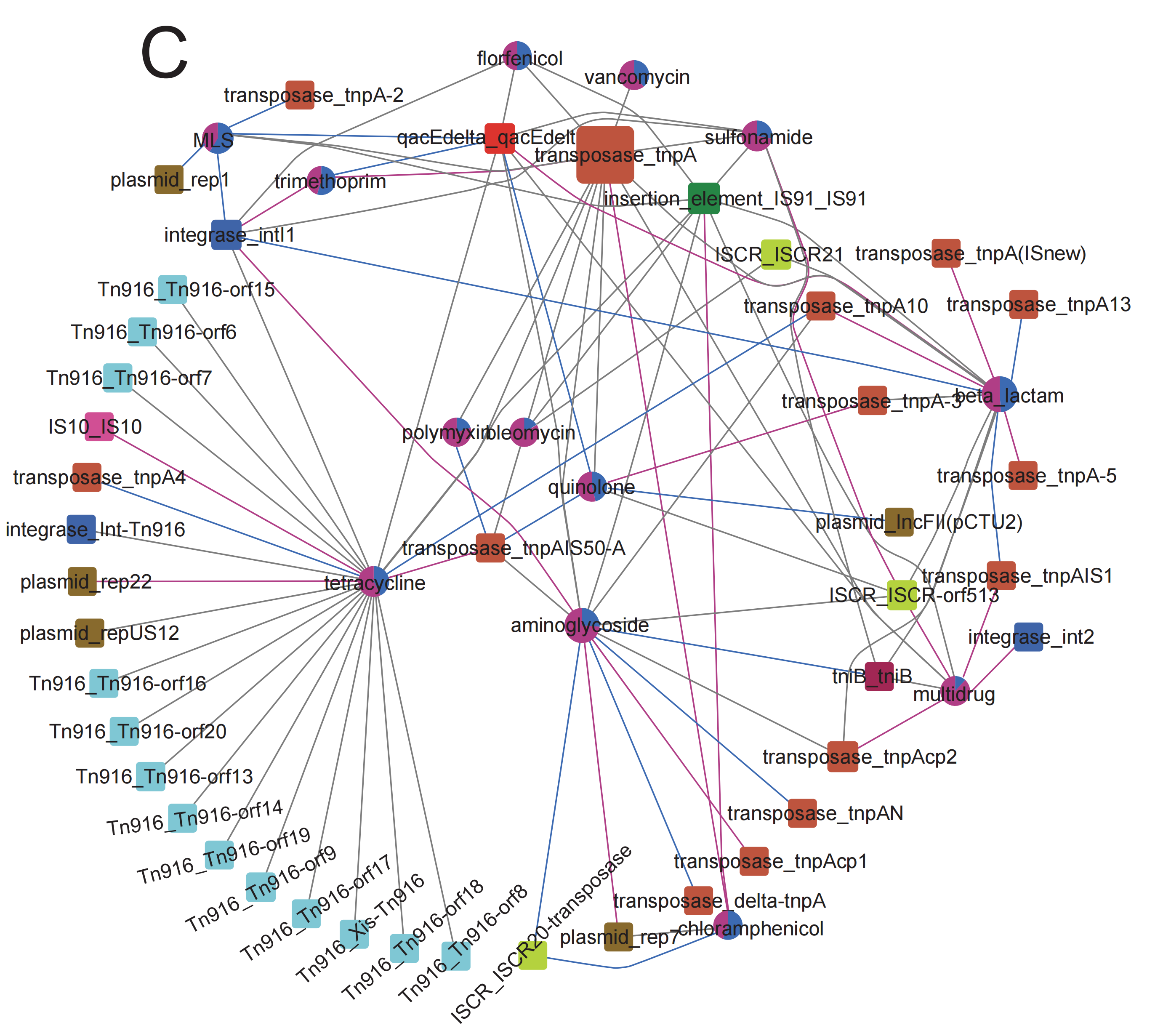 圖3-(A)Procrstes分析和Mantel檢驗(yàn)。(B)三個(gè)熱泵的進(jìn)水和出水中與MRG共存的ARG的相對(duì)豐度的差異。(C)顯示MRG和ARG類型同時(shí)出現(xiàn)的網(wǎng)絡(luò)圖。
