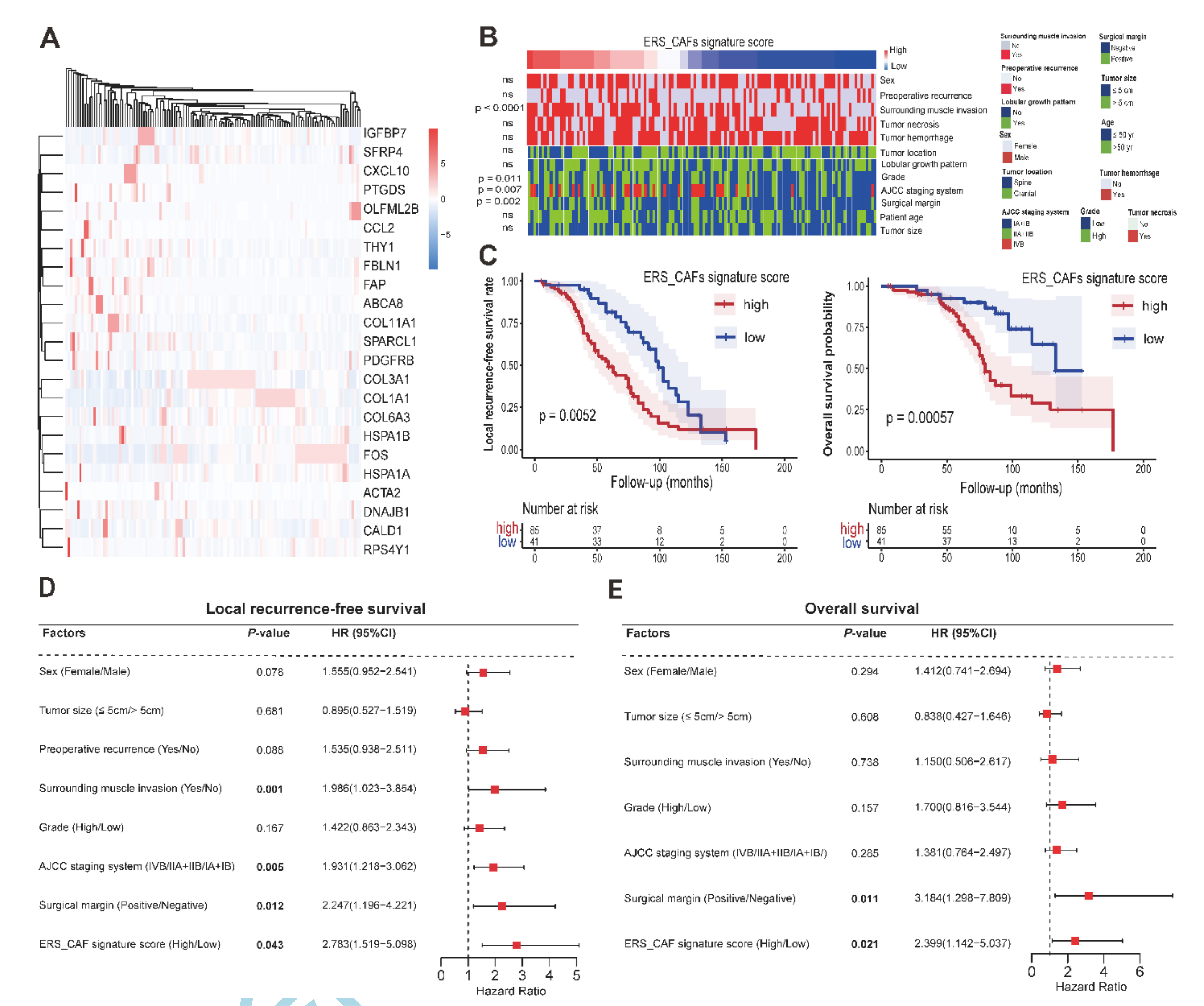 為了驗(yàn)證 ERS-CAF 的促腫瘤作用,該研究對(duì)來(lái)自脊索瘤患者的 126 個(gè)樣本進(jìn)行了總 RNA 測(cè)序(圖 4A)。使用代表該 CAF 子集的基因集計(jì)算每位患者的 ERS-CAF 特征評(píng)分,其中包括 ERS 相關(guān)基因(例如 HSPA1A、HSPA1B、CCL2 和 DNAJB1)和 CAF 特定標(biāo)記(例如 THY1、FAP、?和 COL1A1)。ERS-CAF 特征評(píng)分與臨床數(shù)據(jù)之間的關(guān)系如圖 4B 所示。如上所示,ERS-CAF特征評(píng)分與腫瘤侵犯周?chē)∪猓≒?<?0.0001)、腫瘤分級(jí)(P?=?0.011)、AJCC分期(P?=?0.011)顯著相關(guān)。P?=?0.007)和手術(shù)切緣(P?=?0.002)。與原發(fā)腫瘤患者相比,復(fù)發(fā)腫瘤患者的 ERS-CAF 特征較高(-0.06?±?0.53 vs. -0.10?±?0.51),但這種差異并不具有統(tǒng)計(jì)學(xué)意義(t?=?-0.404)?,p?=?0.687)。對(duì)于生存分析,作者使用在線(xiàn)平臺(tái)確定ERS-CAF特征評(píng)分的閾值,并根據(jù)截止點(diǎn)將患者分為高(>截止)和低(≤截止)亞組。Kaplan-Meier 分析表明,ERS-CAF 特征評(píng)分的增加可預(yù)測(cè)不利的 LRFS 和 OS(圖 4C),在控制 Cox 多元回歸模型中的重要臨床因素后,這一結(jié)果仍然顯著(圖4D–E)。這些數(shù)據(jù)表明使用 GSVA 特征來(lái)反映脊索瘤組織中的 ERS-CAF 亞群的可靠性,并強(qiáng)調(diào)了 ERS-CAF 在調(diào)節(jié)腫瘤進(jìn)展中的重要性。