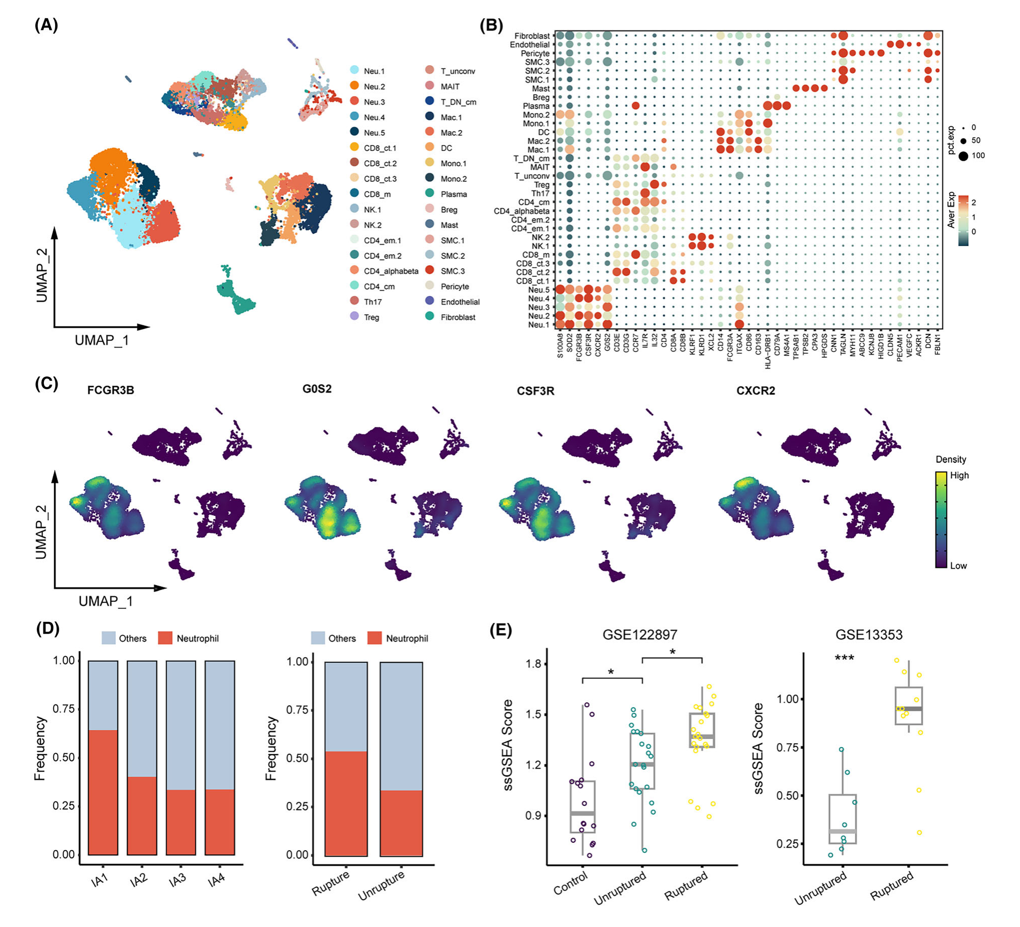 根據(jù)之前明確的基因標(biāo)記,包括FCGR3B、CSF3R、CXCR2和G0S2,總共9025個(gè)中性粒細(xì)胞被人工分配(圖1A–C)。該研究進(jìn)一步使用 Azimuth 自動(dòng)注釋這些細(xì)胞,得到 8435 個(gè)中性粒細(xì)胞。IA1 是一種破裂的 IA 組織,與其他樣本相比,其中性粒細(xì)胞數(shù)量最多(圖1D)??傮w而言,IA 破裂時(shí)中性粒細(xì)胞較多,這可能與 IA 破裂及隨后的局部血栓形成有關(guān)。值得注意的是,ssGSEA 分析顯示,中性粒細(xì)胞浸潤(rùn)發(fā)生在 IA 破裂階段。根據(jù)中性粒細(xì)胞獨(dú)特表達(dá)的標(biāo)記基因,當(dāng) IA 破裂時(shí),IA 形成和中性粒細(xì)胞數(shù)量增加(圖1E)??傊?,這些結(jié)果強(qiáng)烈表明中性粒細(xì)胞參與 IA 進(jìn)展。