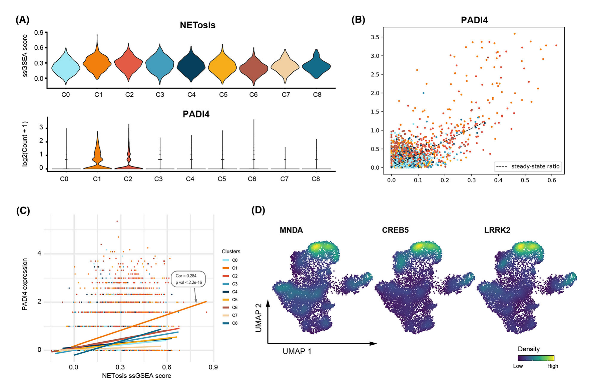 NET 的產(chǎn)生是中性粒細(xì)胞導(dǎo)致 IA 破裂的另一種方式,且取決于稱為 NETosis 的過程。因此,抑制 NETosis 是 IA 有前景的治療靶點(diǎn)。然而,由于這些細(xì)胞的多功能性,發(fā)生 NETosis 的中性粒細(xì)胞亞群尚不清楚。作者的結(jié)果表明 NETs 形成信號(hào)通路在 C1 中富集(圖2B)。該研究從京都基因和基因組百科全書 (KEGG) 數(shù)據(jù)庫中收集了人類 NETosis 基因特征,發(fā)現(xiàn) NETosis 的 ssGSEA 評(píng)分在 C1 中升高(圖7A)。PADI4?的表達(dá)對(duì)于組蛋白瓜氨酸化至關(guān)重要,在 C1 中上調(diào),并表現(xiàn)出正相關(guān)的未剪接/剪接 mRNA 比率(圖 7B),表明PADI4在驅(qū)動(dòng)C1 NETosis中發(fā)揮作用。此外,PADI4的表達(dá)與C1中NETosis的ssGSEA評(píng)分成正比(圖7C),證實(shí)C1易于發(fā)生NETosis。與其他中性粒細(xì)胞相比該中性粒細(xì)胞子集專門表達(dá)?MNDA?(Pct.1?=?91.8%, Pct.2?=?54.5%),?CREB5?(Pct.1?=?74.7%, Pct.2?= 33.7%) 和?LRKK2?(Pct.1?=?78.4%, Pct.2?=?36.2%) ?(圖7D),因此可以作為抑制 NETs 介導(dǎo)的 IA 進(jìn)展的目標(biāo)。