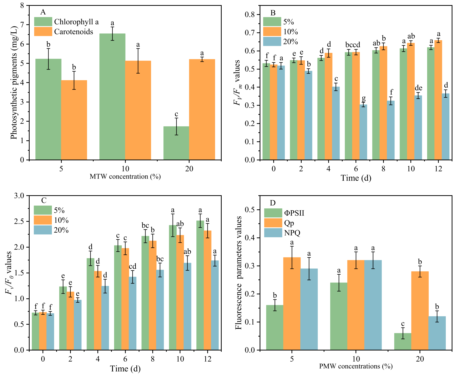 Fv/Fm檢測可以快速評價微藻對生長環(huán)境的適應(yīng)性。隨著PMW濃度的增加,在圖2B中,在第12天,10% PMW的Fv/Fm最高(0.658)。與未添加PMW相比,5% PMW、10% PMW和20% PMW的Fv/Fm分別降低了8%、2%和46%。這表明藻類的能量轉(zhuǎn)化率降低,對微藻的光合作用有一定的抑制作用。在20%的PMW中,F(xiàn)v/Fm值恢復(fù),表明C. muelleri對不利環(huán)境產(chǎn)生了特異性抗性。Fv/F0可用于確定植物的光合效率和生理狀態(tài)。Fv/F0的下降(圖2C)表明C. muelleri供體側(cè)的水分裂復(fù)合物崩潰,導(dǎo)致電子傳遞能力下降。有效量子產(chǎn)率(ΦPSII)可以揭示微藻在不同環(huán)境條件下的生理狀態(tài)和PSII的性能。5%、10%和20% PMW組C. muelleri的ΦPSII分別為0.16、0.24和0.06(圖2D)??傮w而言,10% PMW處理下C. muelleri的光合效率最好,這也有利于PMW處理。