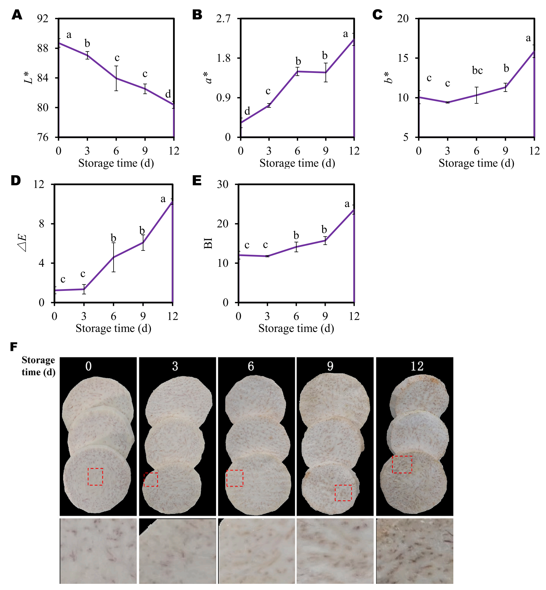 芋片切面顏色隨貯藏時間的變化如圖1A所示。切面L*值從0 d時的88.72下降到12 d時的80.36,冷藏12 d后L*值下降了9%(圖1A)。芋頭切片表面的a*、b*、△E和BI值在冷藏過程中也表現(xiàn)出類似的變化趨勢(圖1B-E)。這些褐變指標(biāo)隨著貯藏時間的延長而增加。冷藏12 d后,a*、b*、△E和BI值分別比0 d增加了582%、58%、725%和19%(圖1B-E)。宏觀褐變癥狀在第6天首次出現(xiàn),并在隨后的儲存過程中逐漸加劇(圖1F)。綜上所述,這些結(jié)果表明,即使在低溫(4℃)條件下,切片芋頭在儲存過程中也會發(fā)生褐變。