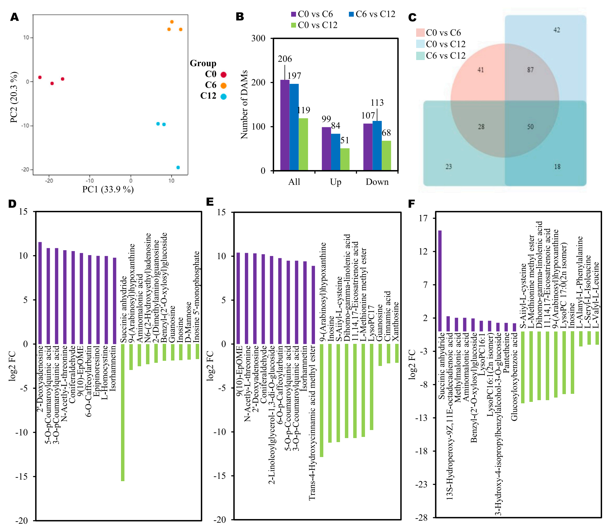 在C0和C12中,9(10)- epOME、n -乙酰- L-蘇氨酸、2 ‘ -脫氧腺苷、5- O -對香豆酰基奎寧酸、2-亞麻油基甘油-1,3-二- O -糖苷、松木醛、6- O -對咖啡酰基熊果甙、異鼠李素、3-O-對香豆?;鼘幩岷头词?4-羥基肉桂酸甲酯在C12組中含量較高。相反,9-(阿拉伯糖基)次黃嘌呤、肌苷、S – aiiyl -L -半胱氨酸、8,11,14-二十烷三烯酸甲酯、L-蛋氨酸甲酯、LysoPC17:0、鳥苷、肉桂酸、11、14、17-二十碳三烯酸和黃嘌呤在C0組中表現(xiàn)出更高的豐度(圖2F)。