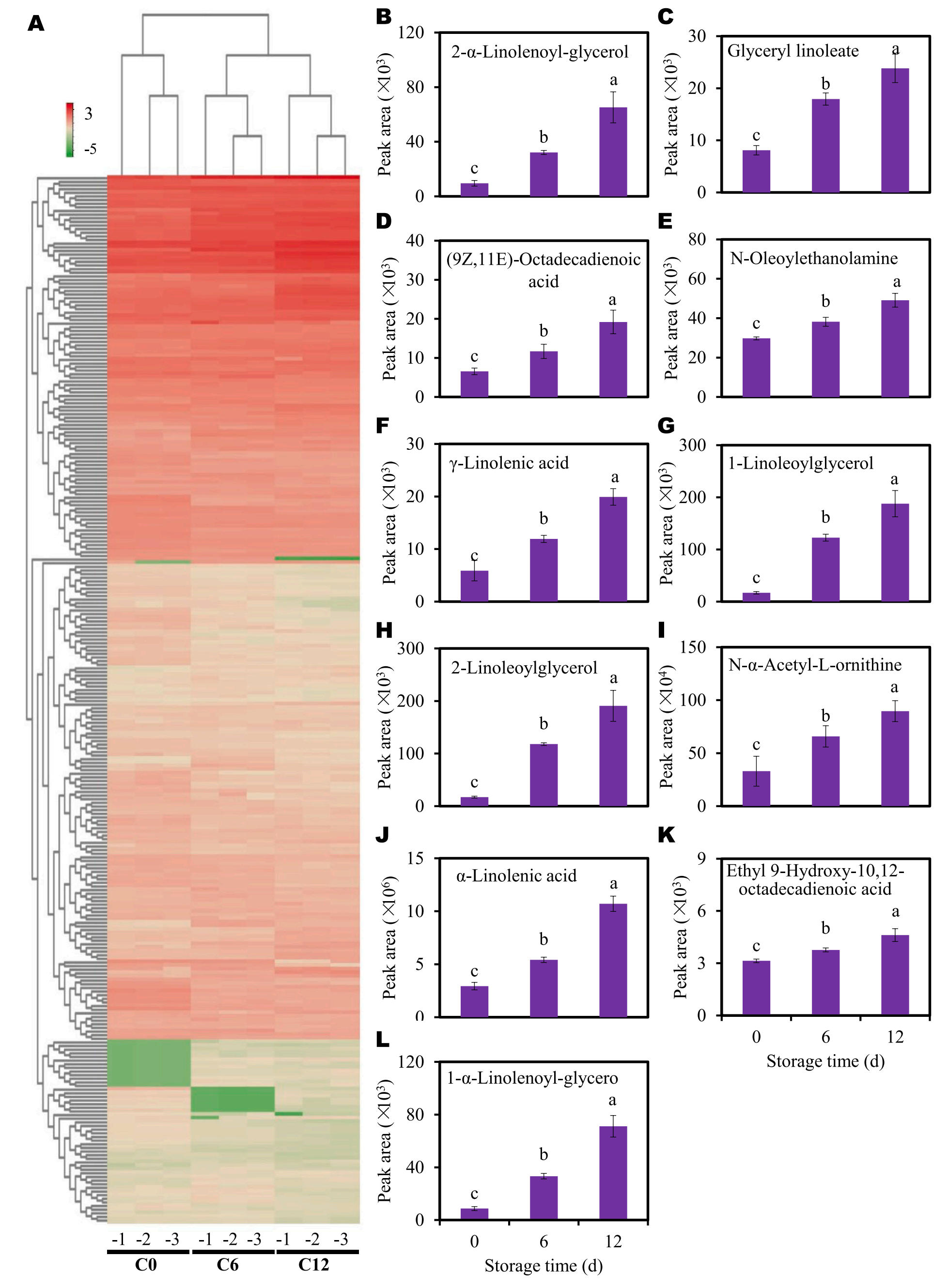 為進一步分析代謝物在9個樣本的積累模式,該研究進行了聚類熱圖分析。結(jié)果顯示,隨著貯藏時間的延長,褐變程度逐漸增加,推測持續(xù)增加的DAMs可能有助于切片芋頭的褐變或促進其褐變過程。因此,該研究關(guān)注分析在褐變過程中豐度持續(xù)上升的DAMs (圖3B-L)。確定了11個DAMs在褐變過程中豐度持續(xù)增加,如2-α-亞麻烯酰甘油、甘油亞油酸、(9Z,11E)-十八烯二烯酸、N-油基乙醇胺、γ-亞麻酸、1-亞麻油基甘油、2-亞麻油基甘油、N-α-乙酰基- L-鳥氨酸、α-亞麻酸、9-羥基-10、12-十八烯二烯酸和1-α-亞麻烯酰甘油。值得注意的是,在這11個DAMs中,有10個是脂肪酸或脂質(zhì)衍生物。幾種褐變指標(biāo)與這些水DAMs之間的相關(guān)系數(shù)非常高。這些結(jié)果表明,在切片芋頭中脂質(zhì)代謝與褐變發(fā)展之間存在潛在的聯(lián)系。