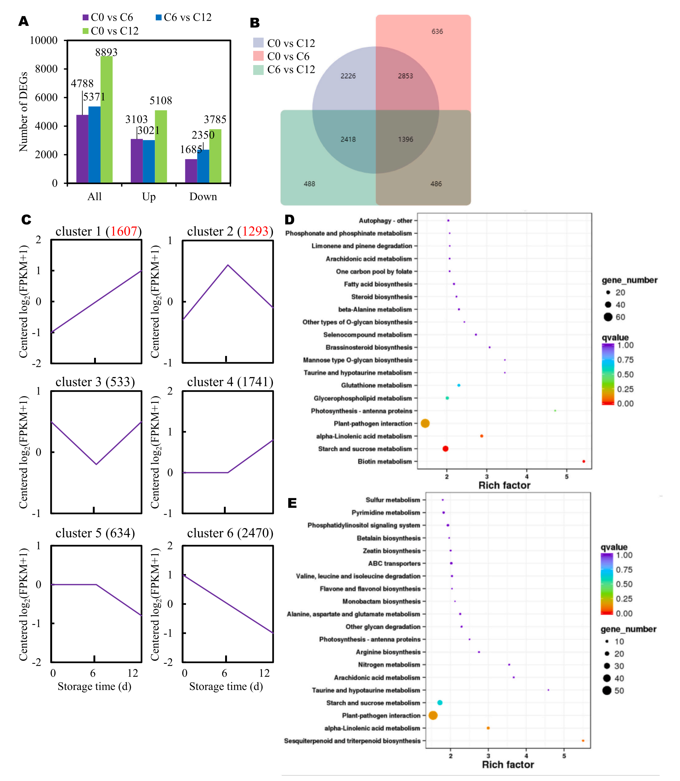 為了更好地了解基因表達的變化,該研究進行比較轉(zhuǎn)錄組分析。結(jié)果顯示許多基因在芋褐變過程中表現(xiàn)出不同的表達譜。具體來說,在C0和C6的比較中,鑒定出3103個表達上調(diào)的基因和1685個表達下調(diào)的基因。同樣,在C6和C12組的比較中,發(fā)現(xiàn)3021個DEGs上調(diào),2350個DEGs下調(diào)。此外,與C0組相比,C12組有5108個基因的表達量更高(圖4A)。在褐變過程中發(fā)現(xiàn)了更多的上調(diào)基因,表明芋頭的基因表達發(fā)生顯著的變化。有趣的是,當(dāng)比較C0與C6、C6與C12、C0與C12之間的DEGs時,發(fā)現(xiàn)1396個DEGs重疊(圖4B)。