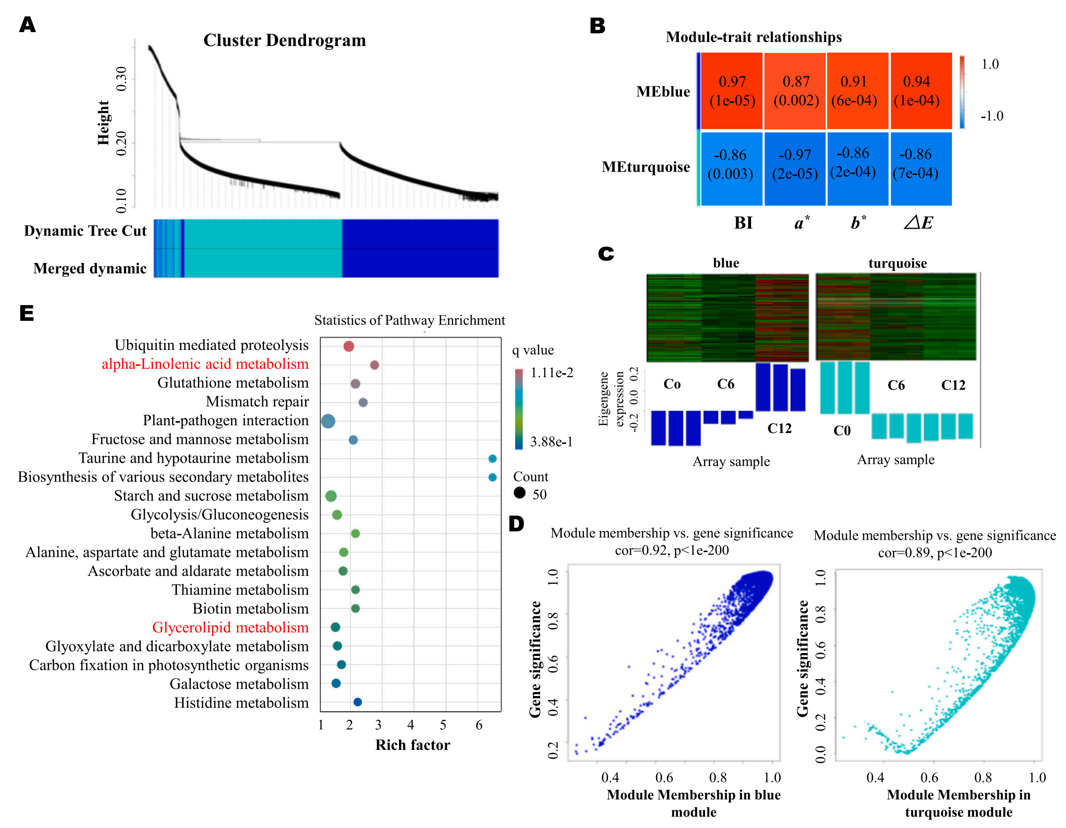 切面褐變的發(fā)生是鮮切行業(yè)中切片芋頭生產(chǎn)和商業(yè)化的一個重要障礙。代謝組學(xué)分析顯示,在芋頭褐變過程中,亞麻酸及其衍生物以及氫過氧化物的含量增加,表明發(fā)生了膜脂降解。RNA-seq分析顯示,參與褐變過程的DEGs富集于α-亞麻酸代謝途徑。WGCNA分析得到了兩個與芋頭褐變密切相關(guān)的模塊,其中藍色模塊的基因與BI呈正相關(guān),強化了膜脂代謝與芋頭褐變之間的聯(lián)系。隨著芋頭褐變的進行,LOX基因的表達和蛋白活性以及MDA的水平增加,表明膜脂過氧化促進了切片芋頭褐變??傊?,該研究結(jié)果強調(diào)了膜脂代謝在切片芋頭褐變中的重要性。這項研究通過轉(zhuǎn)錄組和植物廣靶代謝組分析全面研究了芋頭褐變的機制。