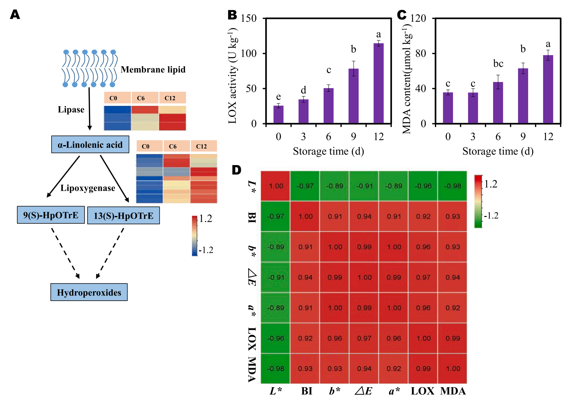 丙二醛通常被認為是植物脂質(zhì)過氧化的生物標(biāo)志物。為了監(jiān)測切片芋頭褐變過程中膜脂過氧化情況,測定了LOX活性和MDA含量。隨著時間的推移,LOX活性和MDA含量隨著褐變繼續(xù)進行逐漸升高 (圖7B, C)。這些結(jié)果表明,在褐變過程中,膜脂過氧化加劇。此外,相關(guān)分析顯示,LOX活性、MDA含量和其他褐變指標(biāo)之間存在很強的相關(guān)性?(圖7D)。這些結(jié)果進一步支持了膜脂過氧化和/或代謝參與芋頭褐變。