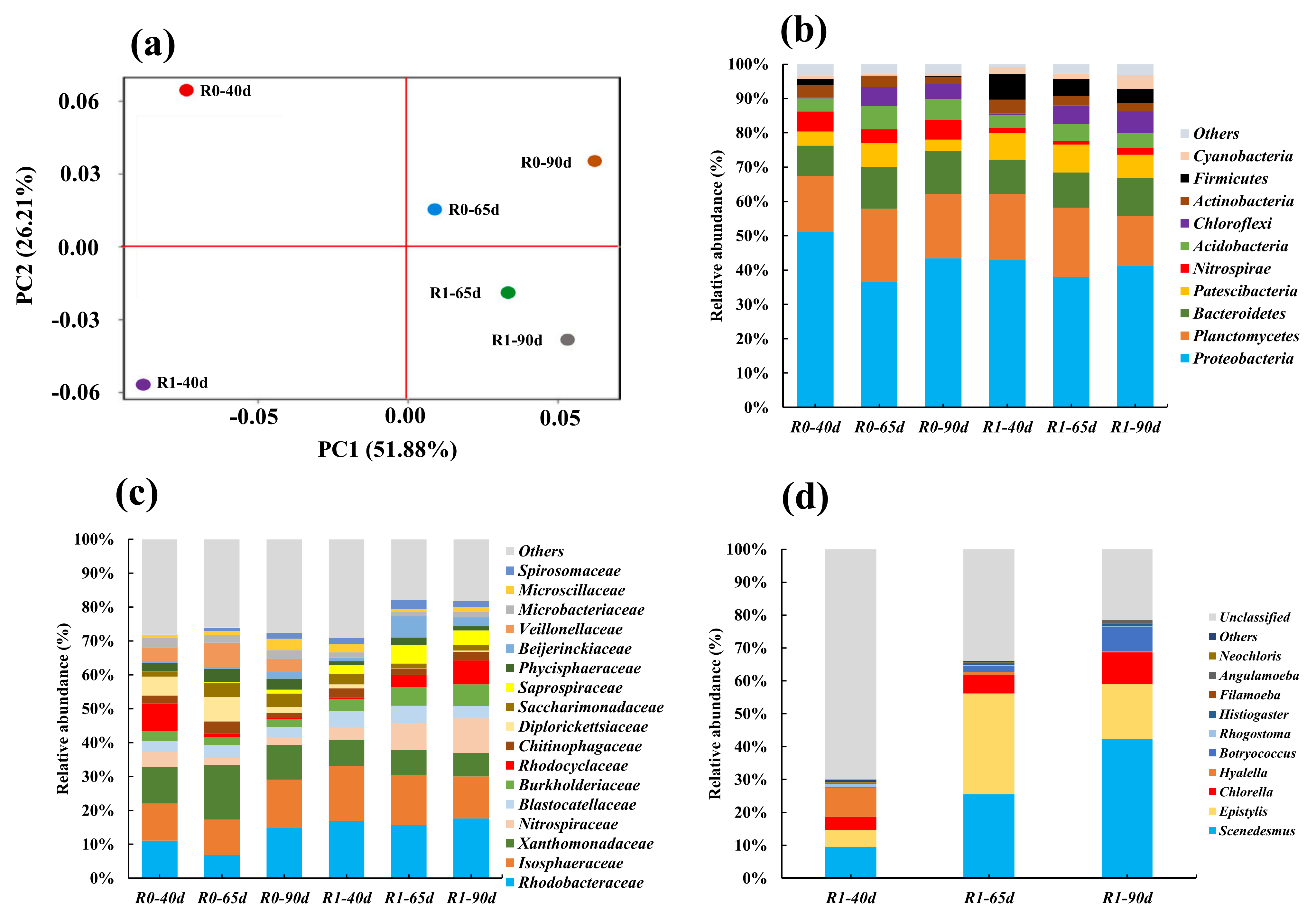 PCoA分析結(jié)果顯示,r0和r1之間在40天時(shí)差異最大,說(shuō)明微藻的生長(zhǎng)導(dǎo)致了BGS和ABGS之間的細(xì)菌進(jìn)化的顯著差異。而在添加抗生素后,R0和R1在第65天和第90天的位置較初始有明顯偏移,表明抗生素的選擇壓力改變了BGS和ABGS的細(xì)菌群落結(jié)構(gòu)。門水平相對(duì)豐度結(jié)果顯示,變形菌門、浮霉菌門和擬桿菌門一直是R0和R1的三個(gè)優(yōu)勢(shì)門,表面其受抗生素影響較小。研究表明,變形菌門和擬桿菌門是好氧廢水處理系統(tǒng)中常見(jiàn)的兩種異養(yǎng)細(xì)菌,主要具有去除氮、磷和水解大分子有機(jī)物的功能,而變形菌門和浮霉菌門對(duì)抗生素具有高度的固有耐藥性,并且與大多數(shù)靶ARGs呈正相關(guān),硝化螺旋菌主要富集在r0中,而厚壁菌門主要富集在R1中。添加抗生素后,氯霉在R0和R1中的相對(duì)豐度上升,而氯霉可作為可移動(dòng)遺傳成分轉(zhuǎn)移的指示物種??扑降姆治鼋Y(jié)果表明,紅桿菌科、異孢菌科和黃單胞菌科是R0和R1的優(yōu)勢(shì)菌,表明他們對(duì)抗生素具有一定程度的耐藥性,并在維持顆粒狀穩(wěn)定性方面發(fā)揮了重要作用。此外,添加抗生素后,硝化螺菌科、紅環(huán)菌科在R0中豐度下降而在R1中上升,腐螺旋菌科也在R1中富集。據(jù)報(bào)道,硝化螺菌科、紅環(huán)菌科和腐螺旋菌科與廢水中營(yíng)養(yǎng)物質(zhì)的去除密切相關(guān),微藻可能促進(jìn)其在ABGS中的生長(zhǎng),也表明ABGS中的微藻生長(zhǎng)也有利于提高硝化螺旋體科、紅環(huán)科和腐螺旋體科的耐藥性。此外,韋榮氏球菌科主要富集在R0中,韋榮氏球菌科與污水處理廠大量ARGs和intI1呈顯著正相關(guān),這可能是造成R0中ABGS中ARGs水平低于BGS的部分原因。真核生物屬水平相對(duì)豐度分析結(jié)果顯示,ABGS中斜生四鏈藻和小球藻的持續(xù)生長(zhǎng)提高了抗生素和常規(guī)污染的去除效率。