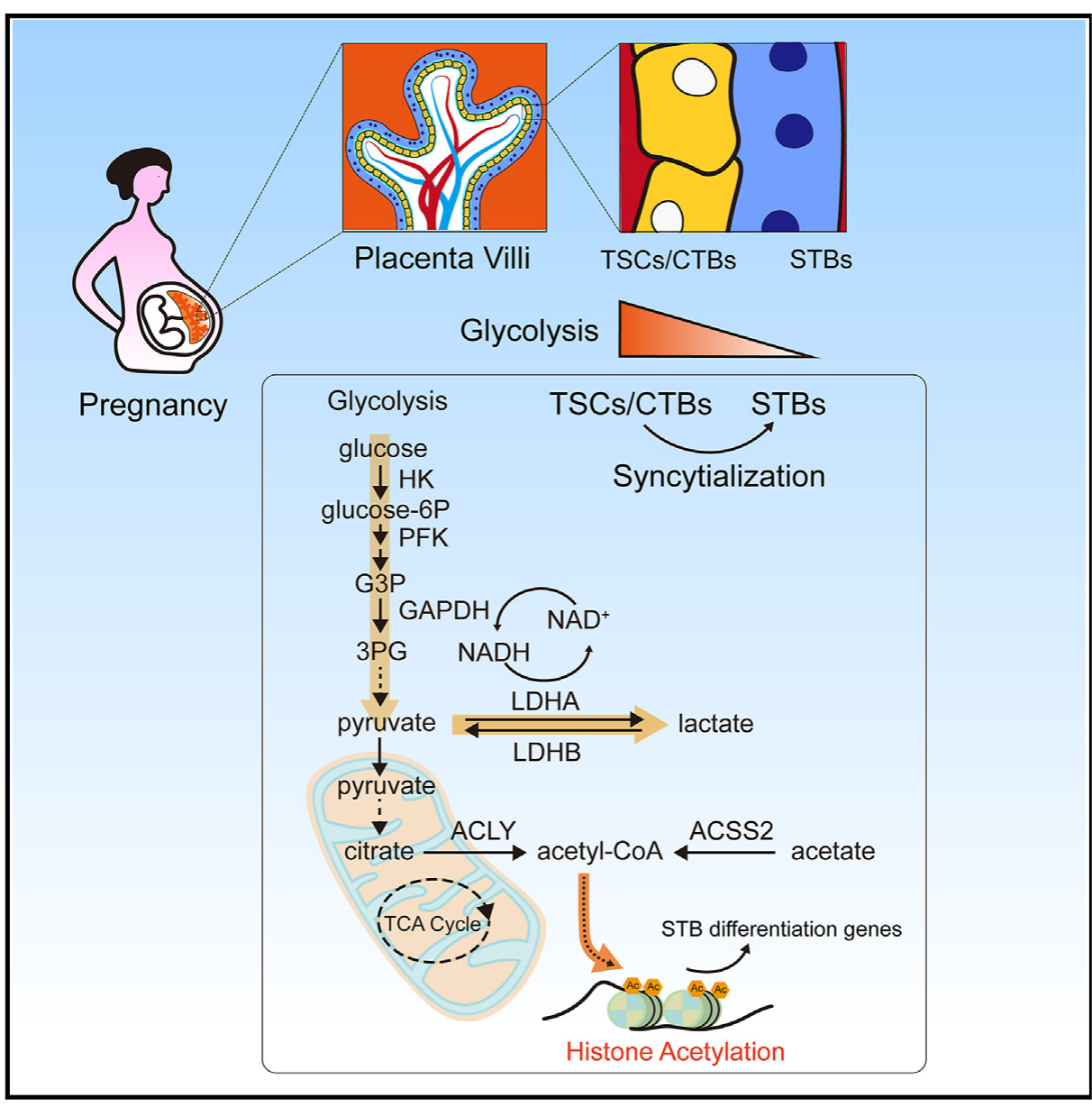 該研究通過代謝組學(xué)、轉(zhuǎn)錄組學(xué)、蛋白組學(xué)和表觀組學(xué)等技術(shù),使用人類妊娠早期胎盤樣本和人類滋養(yǎng)層干細(xì)胞(hTSCs)發(fā)現(xiàn),葡萄糖代謝在hTSCs和細(xì)胞滋養(yǎng)層細(xì)胞中高度活躍,但在合胞過程中,葡萄糖代謝降低到基礎(chǔ)水平,仍然是補(bǔ)充乙酰輔酶A和分化潛力所必需的。補(bǔ)充乙酸可以通過補(bǔ)充乙酰輔酶A和維持組蛋白乙酰化來挽救糖酵解缺乏的合胞滋養(yǎng)細(xì)胞融合,從而挽救合胞基因的激活。即使是短暫的糖酵解缺乏也會(huì)永久性地抑制分化潛能和促進(jìn)炎癥,在體內(nèi)也可以通過短暫補(bǔ)充乙酸永久地挽救。這些結(jié)果表明,hTSCs在合胞過程中僅保留基礎(chǔ)糖酵解乙酰輔酶A代謝,通過營養(yǎng)反應(yīng)性組蛋白乙?;{(diào)節(jié)細(xì)胞命運(yùn),這對(duì)我們理解胎盤和胎兒營養(yǎng)之間的平衡具有重要意義。