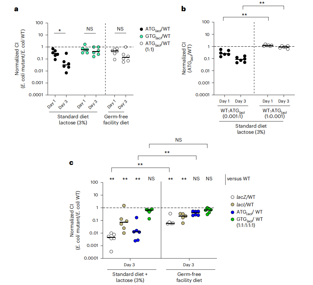 2024年8月19日,瑞士蘇黎世聯(lián)邦理工學(xué)院Wolf-Dietrich Hard團(tuán)隊(duì)在Nature microbiology期刊發(fā)表題為“Non-canonical start codons confer context-dependent advantages incarbohydrate utilization for commensal E. coli?in the murine gut”的論文,研究者分析了小鼠腸道共生大腸桿菌 8178 中的乳糖利用操縱子,發(fā)現(xiàn)乳糖利用相關(guān)的 lacI 基因的起始密碼子并非經(jīng)典的 ATG,而是 GTG,增強(qiáng)了其對(duì)乳糖的利用能力,揭示了非經(jīng)典起始密碼子在代謝競(jìng)爭中的重要功能。