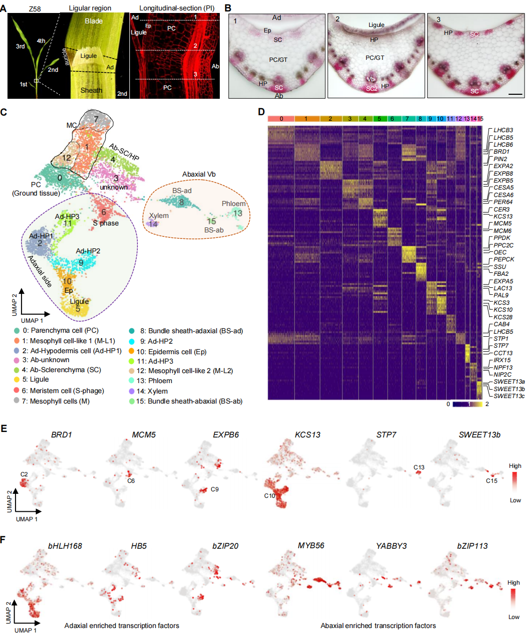 葉片角度(Leaf Angle, LA)是影響玉米種植密度和產(chǎn)量的關(guān)鍵因素。然而,調(diào)控葉片角度形成的機(jī)制尚不清楚。該研究通過(guò)對(duì)不同玉米自交系的莖葉枕區(qū)域進(jìn)行比較組織學(xué)分析,發(fā)現(xiàn)葉片角度大小顯著受到莖葉枕上表皮韌皮纖維細(xì)胞(SC)的初始伸長(zhǎng)和隨后的木質(zhì)化的影響。通過(guò)批量和單細(xì)胞核RNA測(cè)序,生成了莖葉枕區(qū)域的全面轉(zhuǎn)錄組圖譜,并鑒定了許多可能影響其特化為SC的下皮細(xì)胞富集基因。