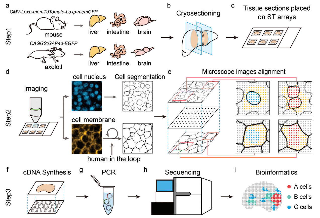 該研究提出了一種新的細(xì)胞邊界定義方法:利用基因編碼的熒光蛋白對(duì)細(xì)胞膜進(jìn)行標(biāo)記,從而能夠在組織切片上精確定位細(xì)胞內(nèi)的測(cè)序位點(diǎn)和轉(zhuǎn)錄本。與基于細(xì)胞核的方法相比,這種基于細(xì)胞膜的方法顯著增加了捕獲的基因數(shù)量,小鼠和墨西哥鈍口螈肝臟中基因數(shù)量分別增加了67%和119%。