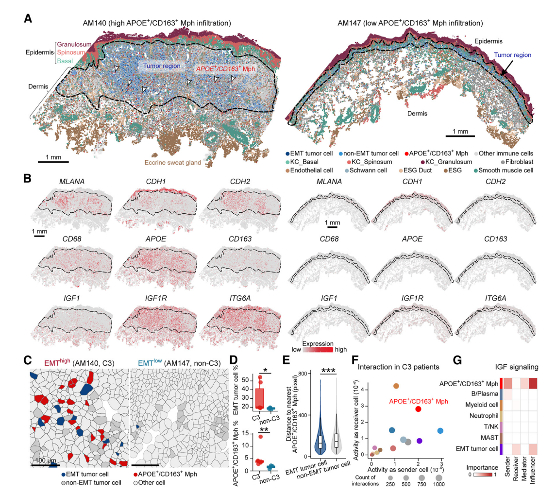 數(shù)據(jù)表明(與單細(xì)胞數(shù)據(jù)聯(lián)合分析)C3 亞型的 EMT 腫瘤細(xì)胞占比高,并且有 APOE+CD163+ 巨噬細(xì)胞的浸潤(rùn),巨噬細(xì)胞與 EMT 腫瘤細(xì)胞具有共定位特征。CellChat 互作分析驗(yàn)證了 APOE+CD163+ 巨噬細(xì)胞的高度受體配體互作,與單細(xì)胞轉(zhuǎn)錄組結(jié)果高度一致(APOE+/CD163+ 巨噬細(xì)胞是空間中 IGF 通路網(wǎng)絡(luò)的發(fā)送者(sender)和影響者(Influencer))。使用空間單細(xì)胞蛋白組學(xué)對(duì)患者腫瘤免疫微環(huán)境進(jìn)行了深入分析,結(jié)果顯示APOE+CD163+ TAM和EMThigh腫瘤細(xì)胞存在高度相關(guān)的定位,這與空間轉(zhuǎn)錄組的結(jié)果一致。