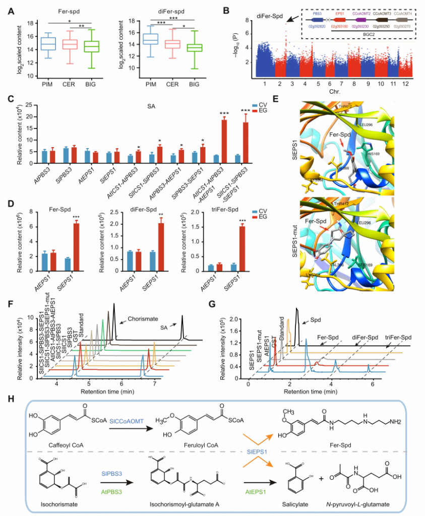 該研究對401份番茄群體材料的酚胺物質(zhì)進行了檢測,通過基于代謝物全基因組關聯(lián)分析(GWAS)鑒定出2號染色體上與酚胺合成基因簇(BGC2)。實驗證明基因簇中核心組分SlEPS1參與水楊酸和酚胺的生物合成,其關鍵氨基酸殘基 His169對酚胺合成至關重要,且SlEPS1的雙酶活性與增強的抗病性相關(圖1)