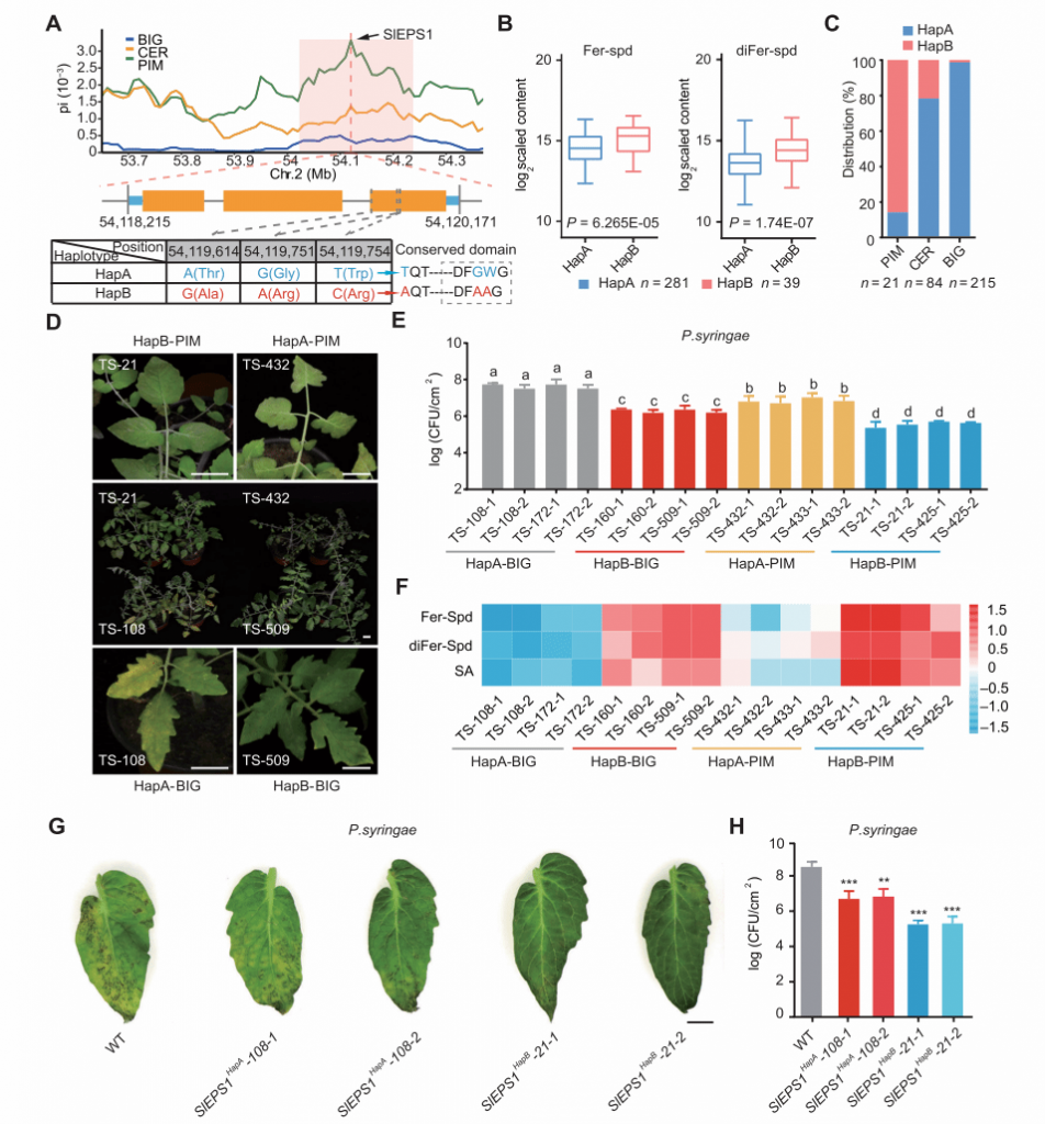 通過比較不同番茄亞群中SlEPS1位點的核苷酸多樣性,發(fā)現(xiàn)該基因可能受人工選擇影響。變異組分析發(fā)現(xiàn)番茄群體間有兩個不同的SlEPS1單倍型組合:SlEPS1HapA和SlEPS1HapB,其中SlEPS1HapB的植株中酚胺和SA水平更高,抗病性更強。這些結果表明,在番茄的馴化選擇過程中,SlEPS1HapB的消失可能是導致番茄抗病性降低的原因之一(圖2)。