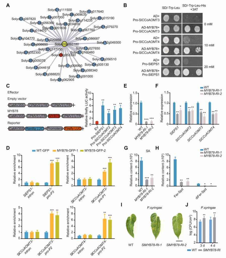 此外,研究還發(fā)現(xiàn)了一個與BGC2顯著共表達的轉(zhuǎn)錄因子SlMYB78。它能夠直接結合并激活BGC2基因簇的啟動子,從而調(diào)控BGC2基因簇的表達。當SlMYB78基因被沉默時,酚胺和水楊酸的含量顯著下降,導致其抗病能力降低(圖3)。