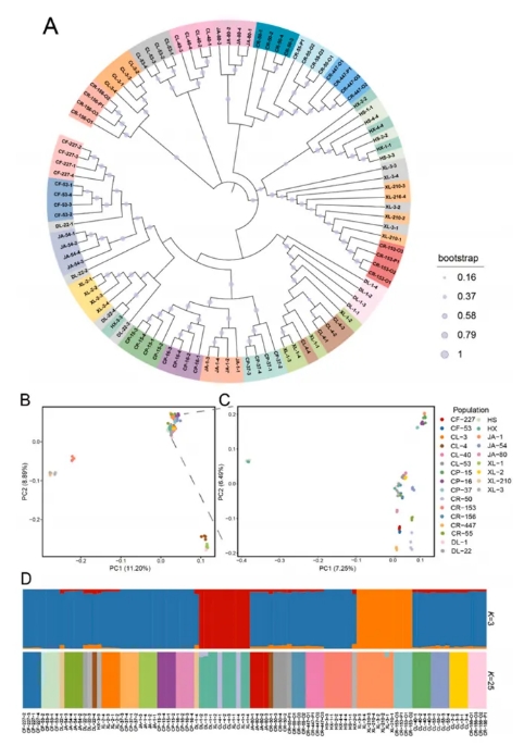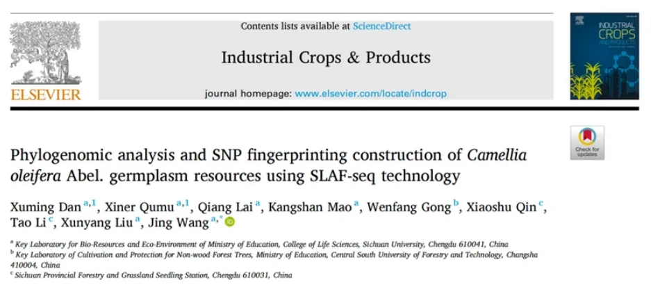 2025年4月2日,Industrial Crops & Products在線(xiàn)發(fā)表了由四川省林草局、四川大學(xué)生命科學(xué)學(xué)院王婧教授課題組聯(lián)合中南林業(yè)科技大學(xué)等多家單位合作完成的研究論文,題為” Phylogenomic analysis and SNP fingerprinting construction of Camellia oleifera Abel. germplasm resources using SLAF-seq technology”。該研究利用SLAF-seq技術(shù),對(duì)四川省主栽的來(lái)自我國(guó)南方25個(gè)主要油茶品種開(kāi)展了系統(tǒng)發(fā)育和群體基因組學(xué)研究,并篩選關(guān)鍵SNP標(biāo)記構(gòu)建了DNA指紋圖譜。該指紋圖譜的構(gòu)建有望為我國(guó)南方尤其是四川地區(qū)油茶種質(zhì)資源保護(hù)、開(kāi)發(fā)利用及品種選育提供關(guān)鍵科學(xué)依據(jù)。