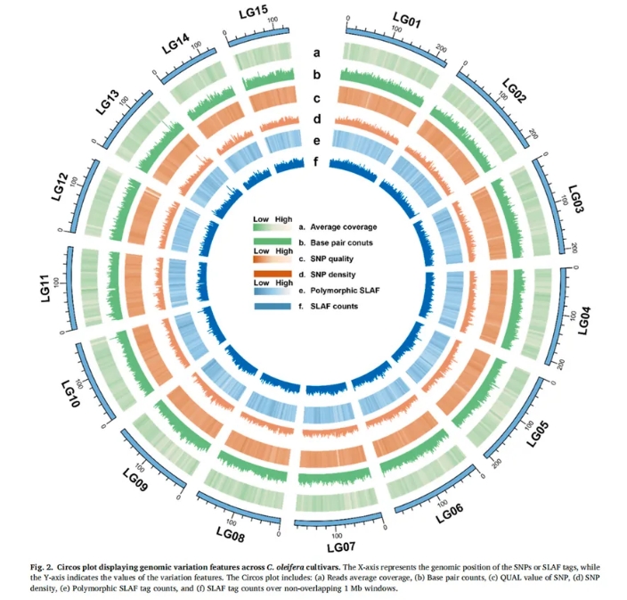 經(jīng)測(cè)序,每個(gè)樣本平均測(cè)序深度為13.95×,共鑒定出470,397個(gè)多態(tài)性SLAF標(biāo)簽,并初步檢測(cè)到36,317,329個(gè)SNP位點(diǎn),經(jīng)過(guò)質(zhì)控過(guò)濾后,最終保留了5,685,673個(gè)高質(zhì)量SNP供后續(xù)分析。這些SNP廣泛分布于油茶基因組的各個(gè)染色體區(qū)域,具有較強(qiáng)的代表性和應(yīng)用潛力,為油茶的遺傳多樣性研究和分子育種提供了寶貴的遺傳資源。 Figure 2展示了SNP位點(diǎn)在各染色體上的分布密度、覆蓋深度和變異質(zhì)量參數(shù),為后續(xù)的遺傳結(jié)構(gòu)分析及品種識(shí)別提供了堅(jiān)實(shí)的基礎(chǔ)數(shù)據(jù)支持。
