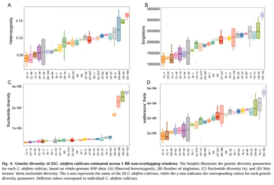 為了全面評(píng)估油茶種質(zhì)資源的遺傳多樣性,研究統(tǒng)計(jì)了包括雜合度(Heterozygosity)、核苷酸多樣性指數(shù)(π)、單態(tài)位點(diǎn)數(shù)量(Singleton)以及Watterson’s θ值等關(guān)鍵遺傳參數(shù)(Figure 4)。結(jié)果表明,川榮(CR)系列品種(如CR-153、CR-55)在各項(xiàng)遺傳變異指標(biāo)上均表現(xiàn)出較高水平,尤其是核苷酸多樣性指數(shù)(π)顯著高于其他品種。具體而言,singleton在長(zhǎng)林(CL)系列品種(如CL-3、CL-4、CL-40)、翠屏(CP)系列(如CP-16)和江安(JA)系列品種(如JA-54)中較少,而在川榮CR-153和CR-55中則為最多(Figure 4B)。核苷酸多樣性(π)值的差異也較為顯著,川榮品種CR-50、CR-156、CR-55和CR-153的π值明顯高于其他品種,表明川榮系列品種具有較高的遺傳多樣性,可能為油茶品種改良和分子育種提供重要的遺傳資源(Figure 4C)。類(lèi)似地,Wattersonθ分析進(jìn)一步揭示了品種間分離位點(diǎn)的變化,川榮CR-153、湘林XL-3和CR-55表現(xiàn)出較高的θ值,與singleton的趨勢(shì)一致(Figure 4D)。近交系數(shù)(F)分析結(jié)果與遺傳多樣性模式一致,顯示川榮CR-156、CR-55和CR-447的F值最低,表明其遺傳多樣性較高,而長(zhǎng)林CL系列品種(如CL-3、CL-40、CL-4)的F值較高,反映其遺傳多樣性較低??傮w而言,遺傳多樣性分析結(jié)果表明,長(zhǎng)林(CL)系列品種由于長(zhǎng)期的人工選育和馴化,遺傳背景較為單一,表現(xiàn)出較低的遺傳多樣性;而川榮系列品種則保持較高的遺傳多樣性。該研究結(jié)果為篩選核心種質(zhì)資源和制定育種策略提供了有力的遺傳依據(jù)。