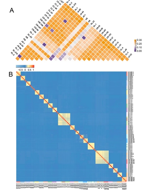 通過(guò)計(jì)算品種兩兩之間的Fst值與構(gòu)建遺傳距離矩陣,研究進(jìn)一步明確了油茶品種間的遺傳分化程度和親緣關(guān)系(Figure 5)。Fst值的分析結(jié)果顯示,長(zhǎng)林CL-4、達(dá)林DL-1與湘林XL-1三者之間的Fst值極低(0.0106–0.0110),這表明這些品種可能源自相同或相似的遺傳背景。類(lèi)似地,川榮CR-153與湘林XL-3、湘林XL-210之間的Fst值也表現(xiàn)出較高的遺傳相似性(0.0036–0.0442),提示這些品種可能具有共同的祖源關(guān)系。相比之下,達(dá)林DL-22與川榮CR-50(0.0816)、川榮CR-55(0.0870)和達(dá)林DL-1(0.0759)之間的Fst值較高,顯示出較為顯著的遺傳分化,反映其與這些品種的親緣關(guān)系較為緊密,但仍保持一定的遺傳獨(dú)特性。其它品種的Fst值范圍從0.1013到0.2908,表明這些品種的遺傳起源更加多樣,可能涉及不同的地理區(qū)域或品種間的較大差異(Figure 5A)。研究人員進(jìn)一步使用GCTA軟件計(jì)算的G矩陣分析,結(jié)果顯示大多數(shù)油茶品種之間的親緣關(guān)系較為明顯,遺傳分化較大(Figure 5B)。然而,一些品種群體的親緣關(guān)系值相似,例如XL-1、CL-4與DL-1;CR-153、XL-3與XL-210;華碩HS與華鑫HX,表明這些品種可能源自相同或相近的祖先背景。與此不同,達(dá)林DL-22品種在其群體內(nèi)部未顯示出顯著的親緣關(guān)系,反映出其群體內(nèi)存在較高的遺傳分化。總體而言,這些分析為理解油茶品種的遺傳背景和親緣結(jié)構(gòu)提供了重要依據(jù),揭示了不同品種之間的親緣關(guān)系及其遺傳多樣性。