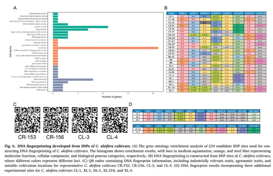 為建立油茶品種的快速鑒定體系,研究人員進(jìn)一步構(gòu)建了25個(gè)主栽油茶品種的DNA指紋圖譜(Figure 6)。在初步獲得的234個(gè)候選SNP中,有196個(gè)位點(diǎn)被注釋為功能明確的編碼區(qū)域突變,富集于DNA連接、RNA加工、果糖代謝等重要通路(Figure 6A)。為提升區(qū)分效率,進(jìn)一步篩除掉存在多變異干擾或功能不明的位點(diǎn),最終篩選得到15個(gè)核心SNP位點(diǎn),可有效區(qū)分全部25個(gè)油茶品種,實(shí)現(xiàn)穩(wěn)定的遺傳身份標(biāo)識(shí)。為確保指紋圖譜的準(zhǔn)確性與應(yīng)用價(jià)值,研究通過(guò)Sanger測(cè)序?qū)?5個(gè)候選SNP位點(diǎn)進(jìn)行了引物驗(yàn)證,最終篩選出8個(gè)多態(tài)性強(qiáng)、峰型清晰的核心SNP位點(diǎn)用于構(gòu)建指紋圖譜(Figure 6B)。這些位點(diǎn)主要分布于功能基因區(qū),涉及次生代謝、胚胎發(fā)育、自噬調(diào)控等關(guān)鍵生物過(guò)程,如編碼α-萜品醇合酶的LG12_G02320和控制胚胎發(fā)育與芽形成的FLA8蛋白基因LG03_G02445等,展現(xiàn)出良好的應(yīng)用潛力。為進(jìn)一步提升指紋信息的實(shí)用性,研究人員還開(kāi)發(fā)了包含8個(gè)位點(diǎn)基因型信息的二維碼系統(tǒng),其中涵蓋了油脂品質(zhì)、農(nóng)藝性狀及適宜種植區(qū)域等數(shù)據(jù),為油茶品種的數(shù)字化管理與選育決策提供便捷、高效的技術(shù)支持(Figure 6C)。二維碼系統(tǒng)為油茶品種的數(shù)字化管理與選育決策提供了便捷、高效的技術(shù)支持。通過(guò)將分子標(biāo)記信息與油茶生產(chǎn)應(yīng)用相結(jié)合,研究成果不僅實(shí)現(xiàn)了分類(lèi)識(shí)別功能,還為分子育種提供了重要參考價(jià)值。