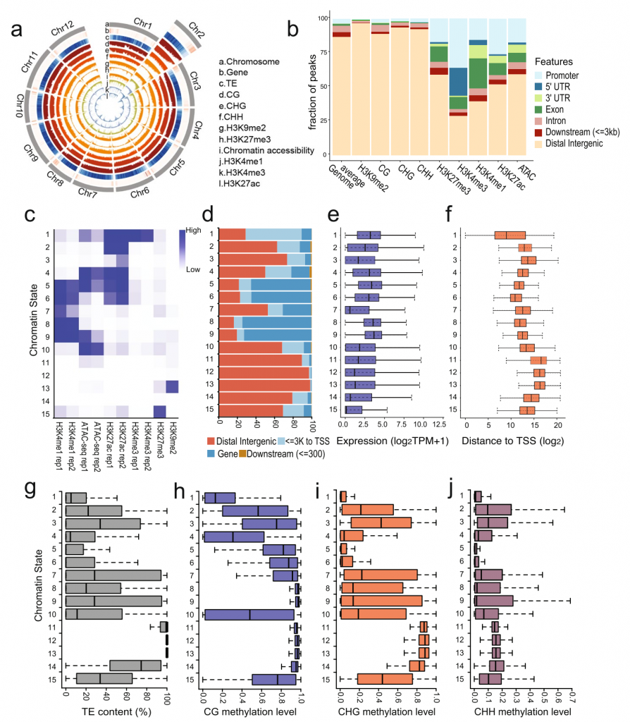 該研究以樟樹(shù)港辣椒為模型,系統(tǒng)揭示了辣椒在全基因組范圍內(nèi)的表觀特征,并在此基礎(chǔ)上推測(cè)包括啟動(dòng)子和增強(qiáng)子在內(nèi)的瞬時(shí)調(diào)控元件。研究發(fā)現(xiàn),辣椒啟動(dòng)子主要由H3K4me3,?H3K27ac和開(kāi)放染色質(zhì)共同修飾,而增強(qiáng)子的特征為開(kāi)放染色質(zhì)。在此基礎(chǔ)上,該研究對(duì)生長(zhǎng)發(fā)育以及脅迫響應(yīng)的調(diào)控元件進(jìn)行了挖掘,并對(duì)部分元件進(jìn)行實(shí)驗(yàn)驗(yàn)證。此外,該研究報(bào)道了辣椒基因組基因間區(qū)H3K4me1H3K27me3共同修飾的區(qū)域,推測(cè)為暫時(shí)未表達(dá)(poised)的調(diào)控元件,其具體分子功能有待驗(yàn)證。
