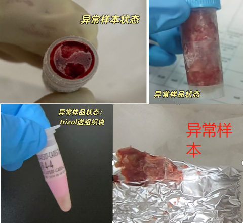 7)凍融組織: 組織凍存后,一旦凍融,核酸降解概率大于 80%,幾乎不可能提取成功,此類(lèi)組織不建議送樣。請(qǐng)各位老師送樣前注意組織保存狀態(tài), 確保組織未發(fā)生過(guò)凍融情況