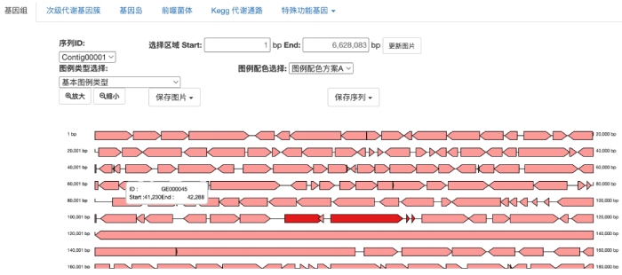 云平臺內置【基因組圖譜展示工具】,點擊即可查看基因組環(huán)形圖、基因位置分布等信息,直觀掌握基因組結構(示意圖如下)