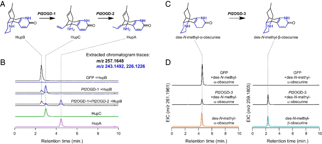 為進一步研究其他下游生物合成途徑。特別是,兩種石松生物堿,des-N-methyl-α-obscurine(DNMAO)和des-N-methyl-β-obscurine(DNMBO),與HupB共享相同的碳骨架,可能是HupB的前體(圖 5)。因此作者通過與上述已知基因的高共表達分析及體外酶活驗證實驗發(fā)現(xiàn)另一種獨特的2OGD酶(Pt2OGD-3)能將DNMAO轉化為DNMBO(圖5),從而形成最終在HupA中發(fā)現(xiàn)的吡啶酮環(huán)。并且發(fā)現(xiàn)Pt2OGD-1和Pt2OGD-2可以依次作用于DNMBO,以產生假定的HupC和HupA的8,15-二氫同系物。Pt2OGD-1不作用 DNMAO,表明在DNMBO和HupB中發(fā)現(xiàn)的吡啶酮環(huán)的存在對Pt2OGD-1底物結合和/或催化活性至關重要,但是參與其中的去飽和酶尚未被發(fā)現(xiàn)。