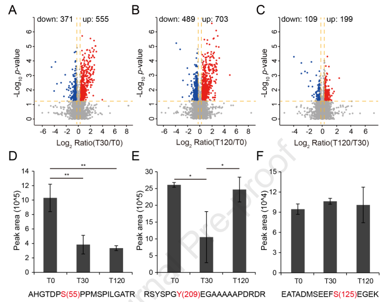 為了深入了解擬南芥對鹽脅迫響應中蛋白磷酸化介導的信號,作者使用GreenPhos和單次LC-MS檢測,分析了100 mM NaCl處理30分鐘(T30)和120分鐘(T120)或未處理(T0)的擬南芥幼苗的磷酸化蛋白質組學(圖4A)。每個處理包括3個生物學重復,每個重復600μg蛋白用于磷酸肽的富集。總共從4316個磷酸化蛋白中鑒定出12908個磷酸肽,含有15889個磷酸化位點。在磷酸肽中,13473個磷酸位點在處理的至少一個重復中包含可量化的信息。