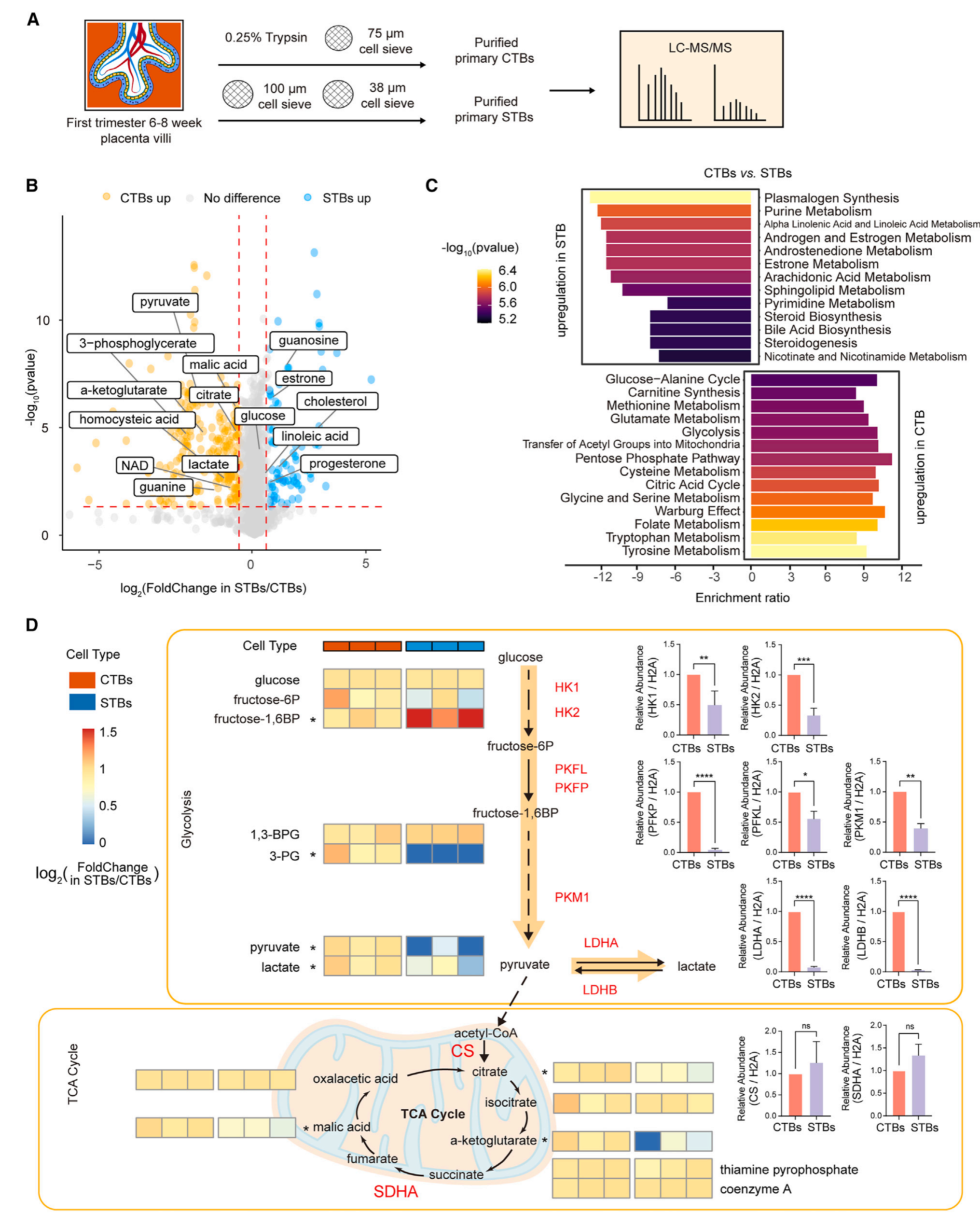 此外,將代謝組學結果與葡萄糖代謝的蛋白質分析結果聯(lián)合分析(圖2D)。結果表明,CTBs和STBs代謝產物的變化與代謝酶蛋白的變化一致。CTBs的糖酵解代謝物、3-PG、丙酮酸和乳酸明顯高于STBs(圖2D)。CTBs中TCA循環(huán)中的檸檬酸、α-酮戊二酸和蘋果酸明顯高于STBs(圖2D)。相比之下,STBs體內類固醇激素代謝的相關關鍵代謝物較高,這與STBs合成激素的特點相一致。綜上所述,CTBs和STBs之間的代謝程序存在明顯差異。在高度增殖和未分化的CTBs中,葡萄糖代謝和氨基酸代謝更為活躍,而在有絲分裂后和分化的STBs中,脂肪酸代謝和類固醇激素代謝更為活躍。