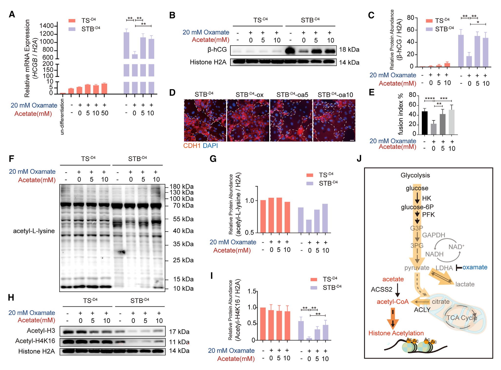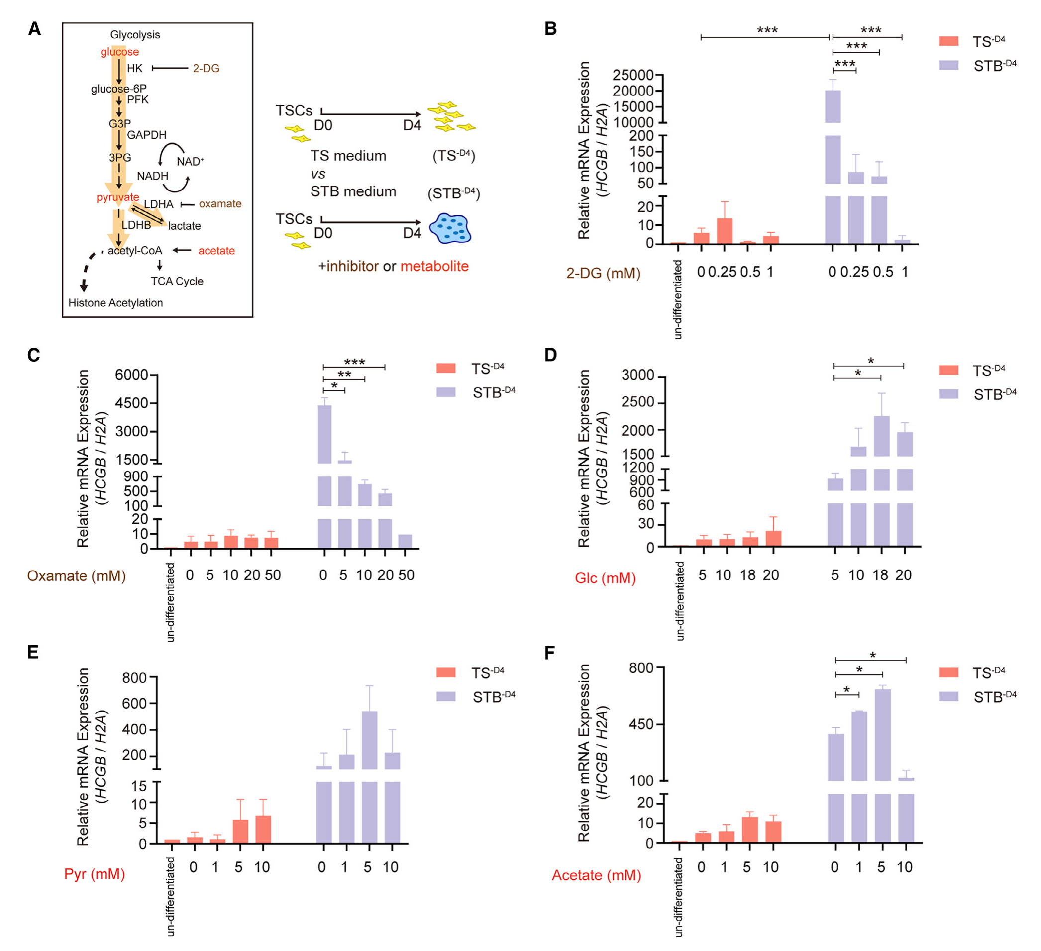 接下來,該研究使用糖酵解的關鍵代謝物,包括葡萄糖、丙酮酸和醋酸酯(用于補充細胞內乙酰輔酶A),來探索糖酵解代謝物對人滋養(yǎng)細胞合胞的影響。結果表明,隨著葡萄糖濃度的增加,從5到18 mM,STB-D4細胞中HCGB以及SDC1、ERVFRD1、ERVW1、GCM1、PSG4和CYP19A1的表達逐漸增強,滋養(yǎng)細胞的合胞化程度逐漸增強(圖3D)。丙酮酸處理在未分化的hTSCs和正在合胞的hTSCs中導致了類似的反應,即一定濃度范圍內(10 mM)的代謝物增加了滋養(yǎng)細胞的合胞 (圖3E)。同樣,在一定濃度范圍內,乙酸也顯著促進滋養(yǎng)細胞合胞(圖3F),在超高濃度下,HCGB、GCM1、PSG4和CYP19A1被顯著抑制(圖3)。特別指出,糖酵解藥物和中間體對HTSCs和STBs的合胞有特異性作用,但對未分化的htsc沒有特異性作用。因此,涉及STB特異性信號傳導,并且調節(jié)滋養(yǎng)層合胞化可能需要較佳水平的基礎糖酵解物質。